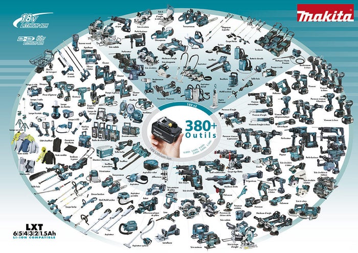 En plus d'être la plus complète du marché, sa gamme d'outils à batterie 18V bénéficie des temps de charge de batterie les plus rapides, grâce à sa technologie de charge intelligente. La gamme croissante d'outils à batterie 18 V de Makita comprend des machines pour toutes les applications, offrant plus de capacité, des durées de fonctionnement plus longues et des propriétés ergonomiques uniques.