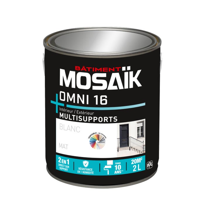 La peinture Mosaik OMNI 16 est une peinture multisupports conçue pour une protection extrême des supports. • Hautement résistante aux intempéries et aux UV pour vous assurer un résultat de qualité professionnelle pour environ 10 ans. • Elle s'applique directement sans sous-couche sur de nombreux supports tels que l'aluminium, le PVC, le bois, le galva, le cuivre, l'inox ou encore le mélaminé.