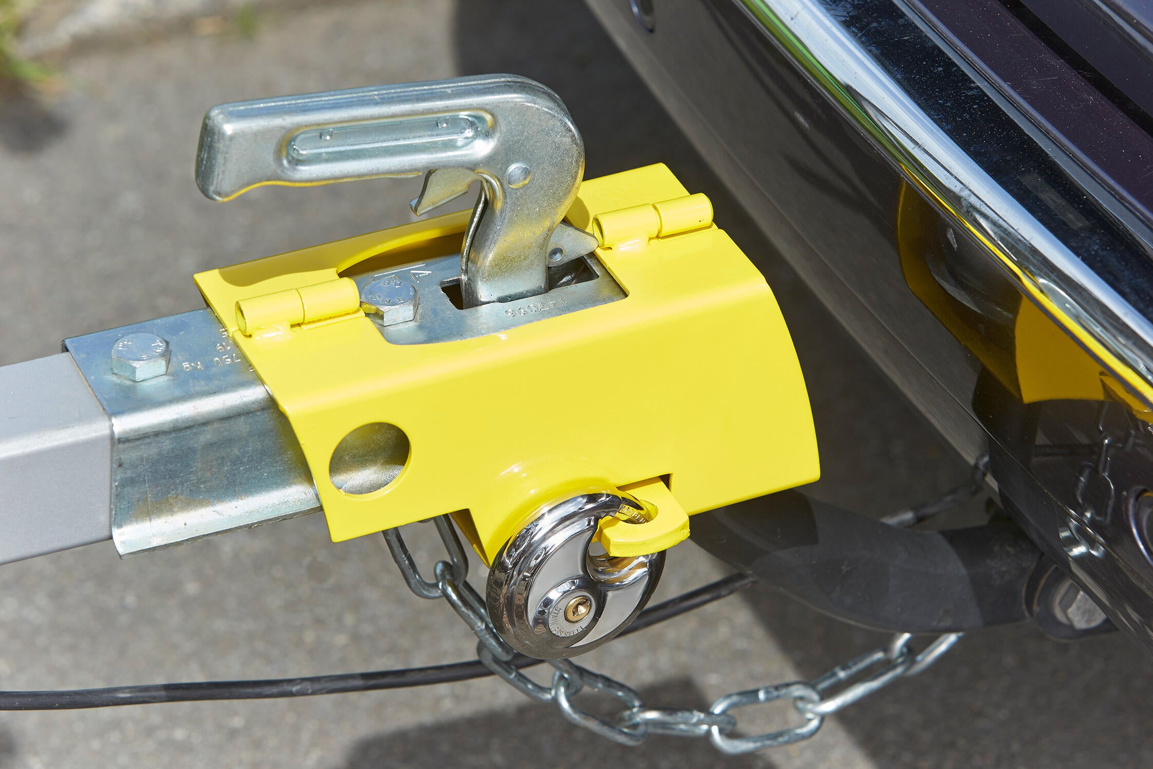 Antivol universel pour remorque attelée ou désattelé. Livré avec un cadenas discus haute sécurité Coloris jaune Long. 20 x Larg. 9.5 x HT 10cm.
