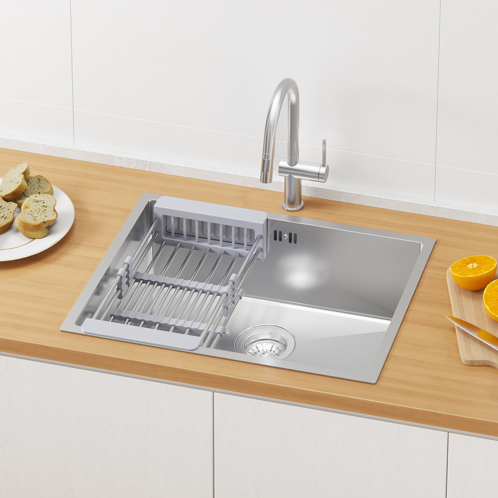→Matériau en Acier Inoxydable: La matière première de l'évier est l'acier inoxydable SUS304 de qualité alimentaire, et doté d'excellentes propriétés de résistance aux rayures, à l'usure et à la corrosion. Le réservoir intérieur de l'évier a une épaisseur de 0,8 mm, est robuste, durable et indéformable.