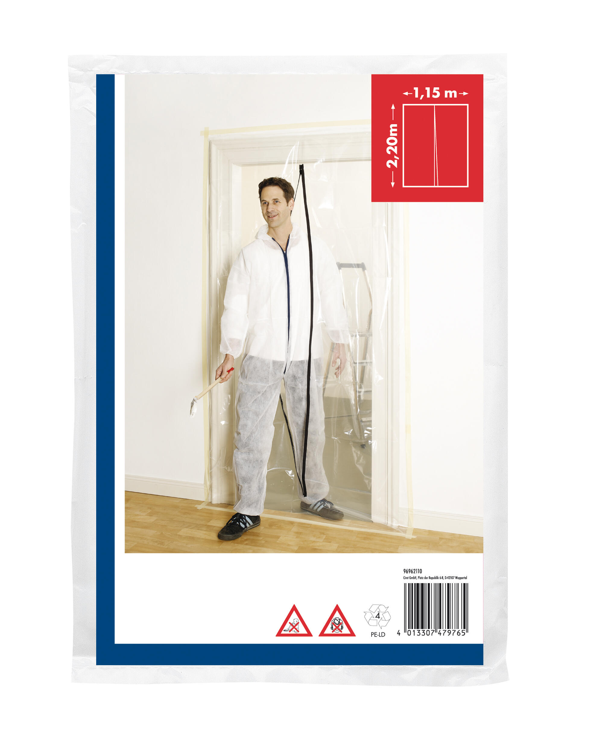 Bâche de protection en plastique conçu pour les portes. Anti-poussière avec fermeture éclair. peut être ouverte des deux côtés et peut être équipée d'un cadenas. Dimension : l.1,10 x h.2,20 m. Forme en C.