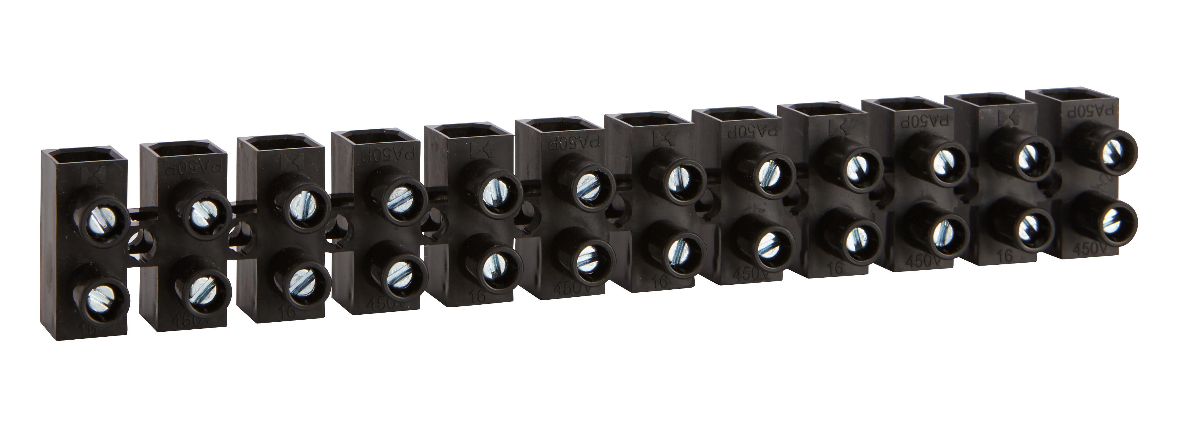 Barrette de connexion ou également appelés domino et sucres /Diamètre du fil : 16mm² / 12 éléments à vis imperdables / Barrette de connexion sécable / Couleur : noir / Durée présence pièces détachée : Ce produit ne dispose pas de pièces détachées