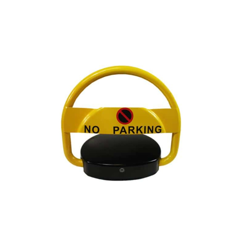 - Barrière de parking télécommandée composée d'une base en acier recouverte d'un couvercle étanche noir sécurisé à l'aide d'un verrou à clés (2 clés fournies) et d'un arceau en métal laqué jaune