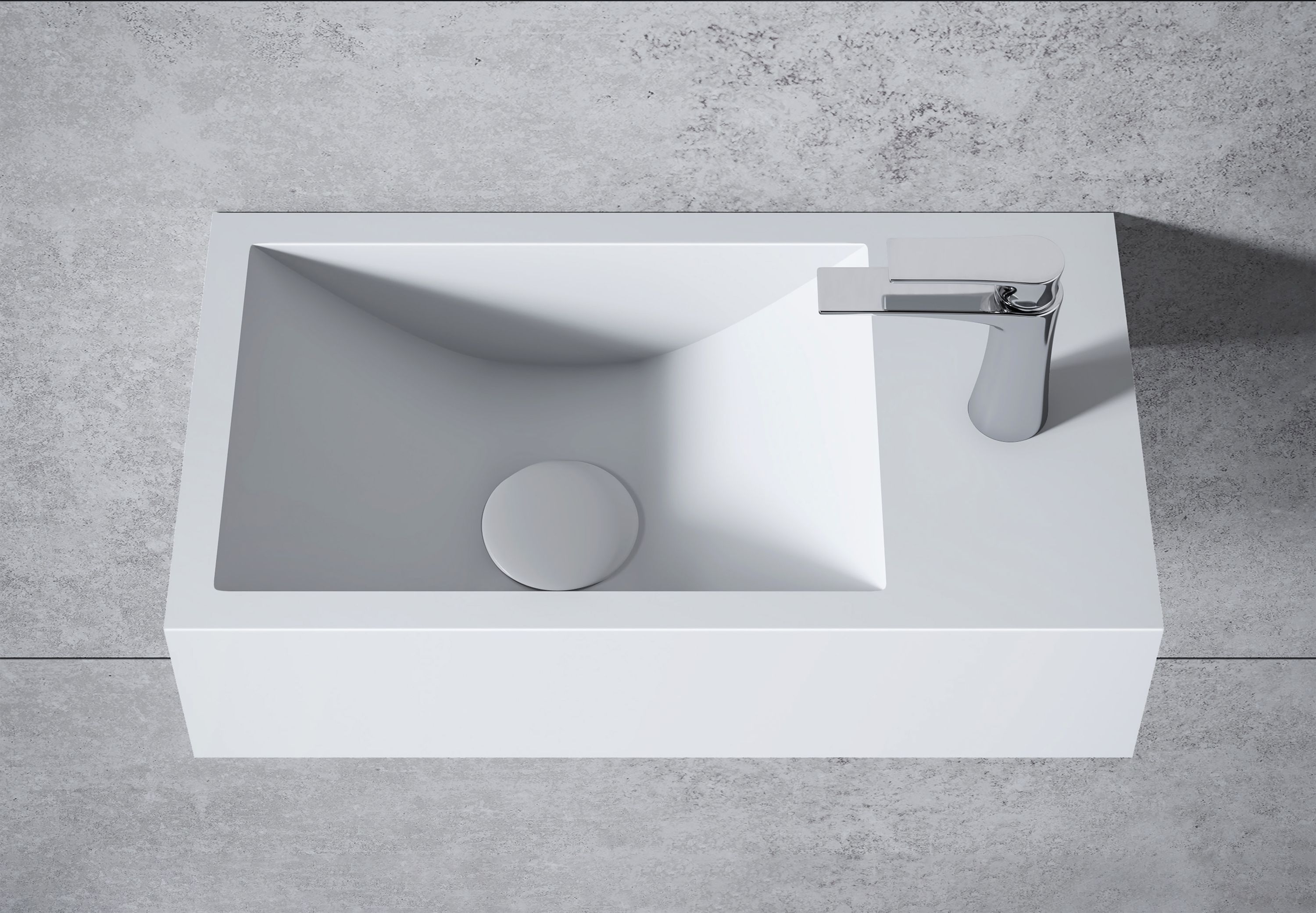 BERNSTEIN - Vasque murale suspendue design 44x22x10cm en fonte minérale - Blanc mat, Avec bonde et cache blanc, Rangement droite, Sans console