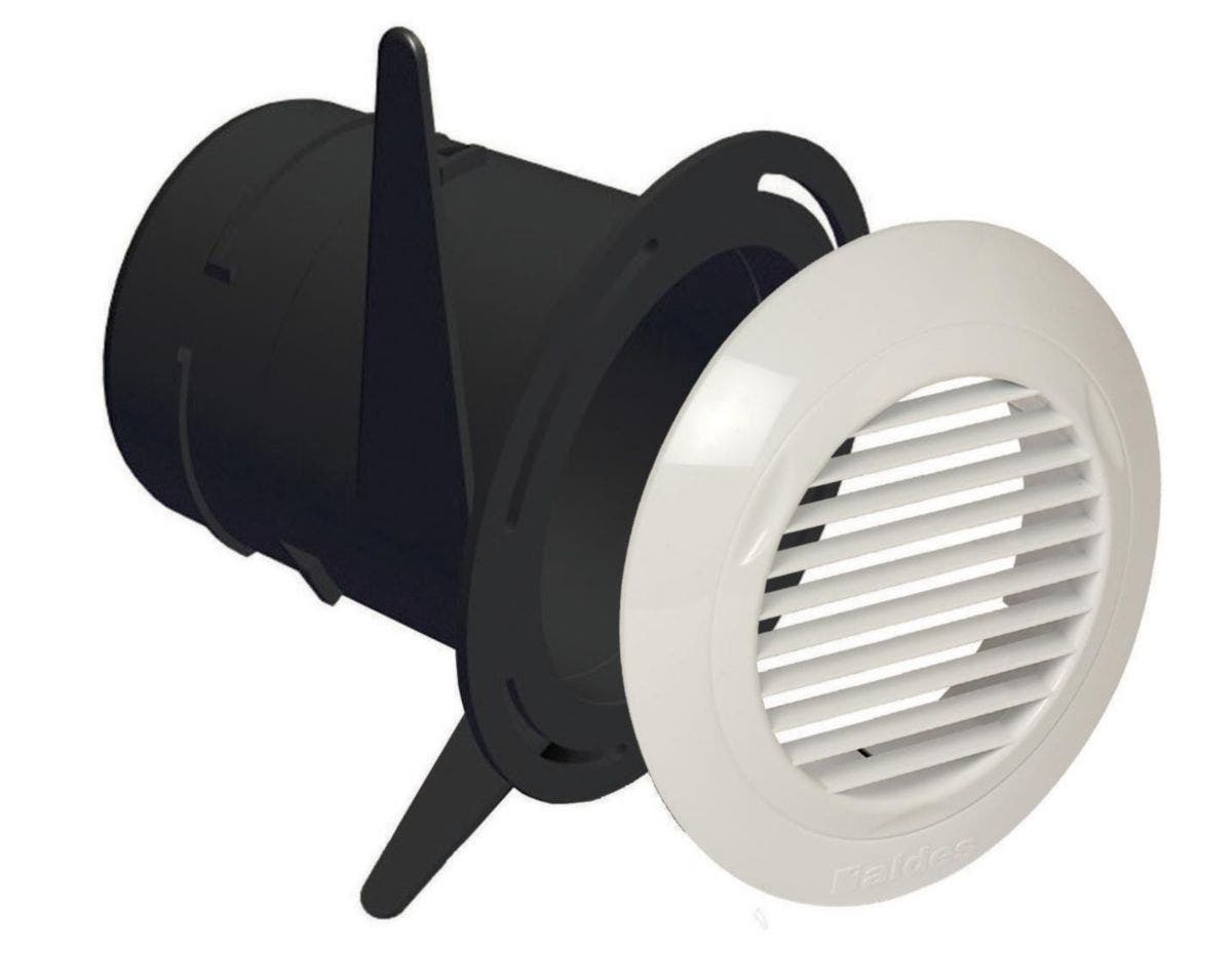 Bouche de soufflage ou reprise pour toute ventilation. Positionnement mural en soufflage et mural ou plafond en reprise (VMC autoréglable). KIT bouche + manchette Trident ⌀80, pour réseau d’extraction VMC simple flux autoréglable ou diffusion (double flux)