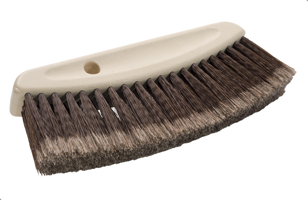 Brosse époussette demi-lune pour épousseter et le marouflage. Semelle en bois poncé. Fibres 100% synthétiques en PVC sur 4 rangs. Trou de suspension de Ø 12mm.