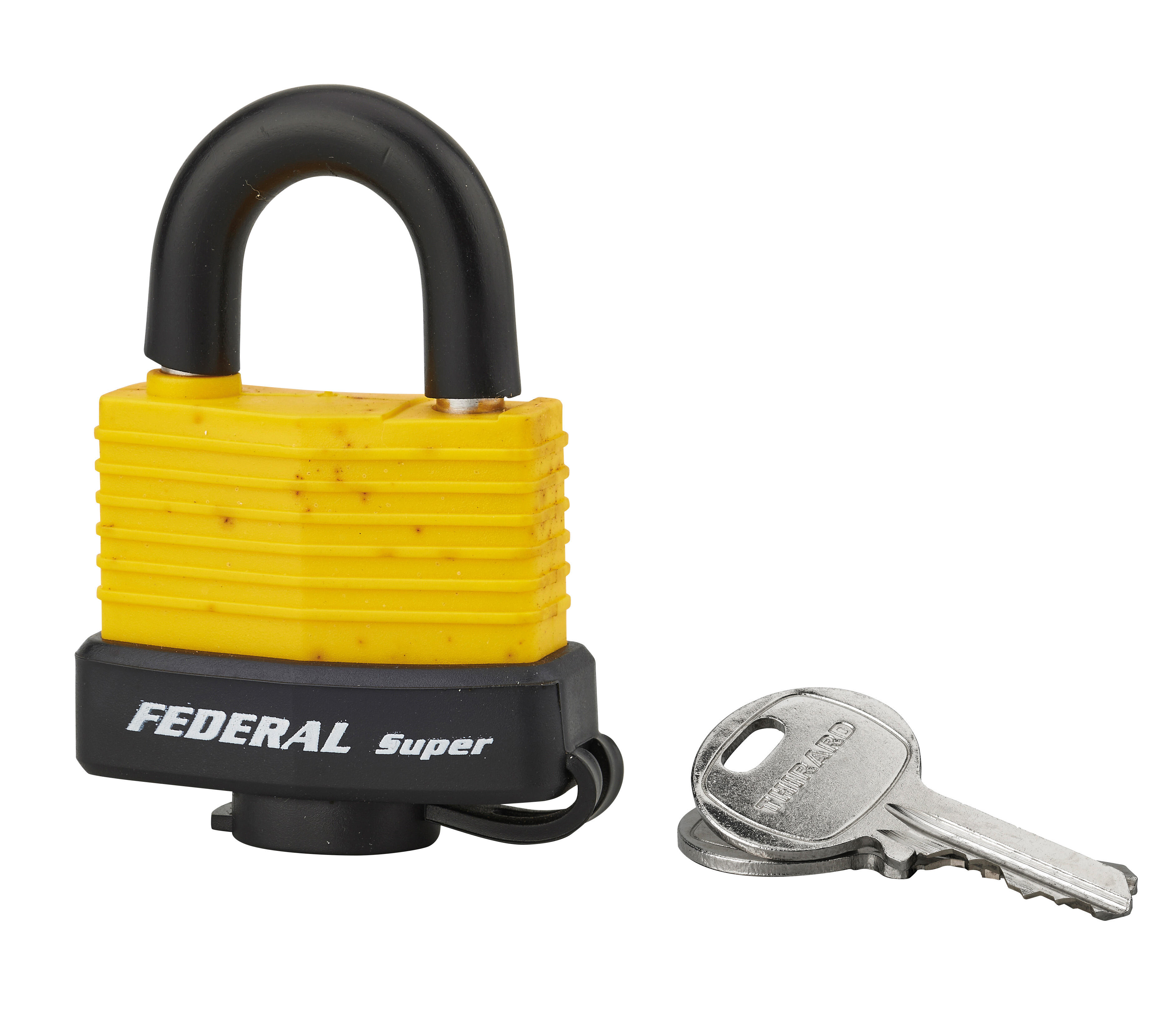 Corps laiton gainé PVC. Anse inox gainé PVC. Double verrouillage par billes inox. Mécanisme à goupilles. 2 clés laiton nickelé.
