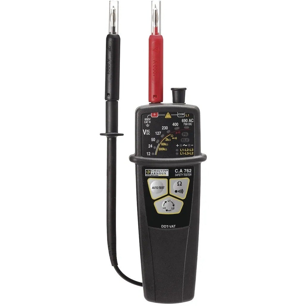Détecteur Vérificateur d'absence de tension (VAT/DDT) CA 762 IP2X, référence P01191762D de la marque Chauvin Arnoux Autotest complet intégré Test de tension jusqu'à 690 VAC (16 2/3 Hz - 800 Hz) / 750 VDC Test de phase unipolaire Contrôle de l'ordre des phases jusqu'à 400 Hz Test de continuité Pointes de touche et cordon amovibles Livré sous blister complet et prêt à l'emploi avec 1 cordon porte-pointe de longueur 1,10 m de couleur noire, 1 jeu de pointes de touche IP2X Ø 4 mm amovibles (1 rouge/1 noire), 1 dragonne, 2 piles 1,5 V LR03/AAA et 1 notice de fonctionnement en 5 langues. Complétez avec une sacoche pour VAT