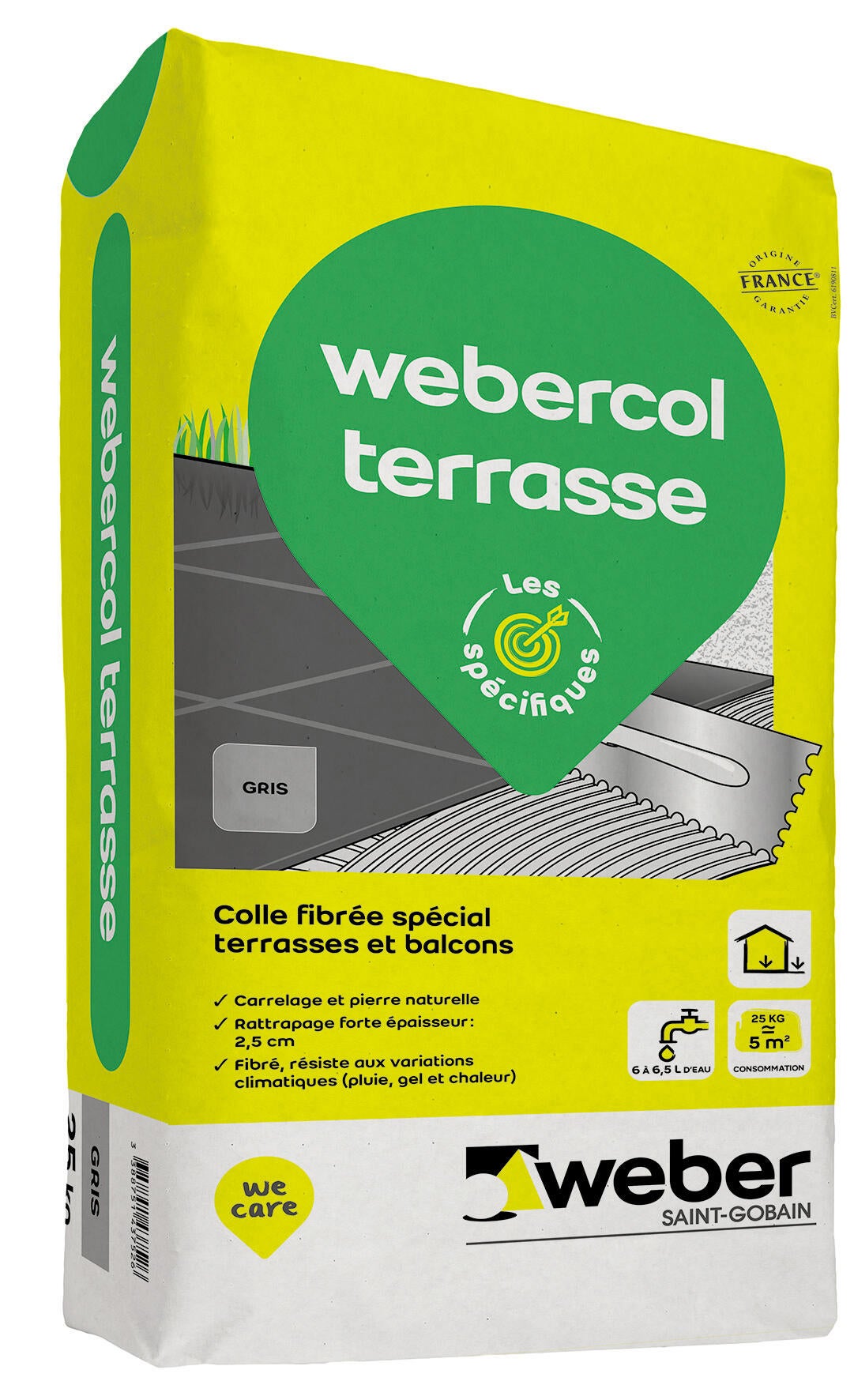 Mortier colle fibrée pour la pose de carrelages, pierres naturelles, pierres reconstituées, à base ciment et dalles gravillonnées, de moyens à grands formats, sur supports neufs et anciens en sols extérieurs, intérieurs et plages de piscine de carrelage et pierre. Rattrapage forte épaisseur 2,5 cm. Fibré, résiste aux variations climatiques (pluie, gel et chaleur). Mention légales : Dangereux. Respecter les précautions d’usage.