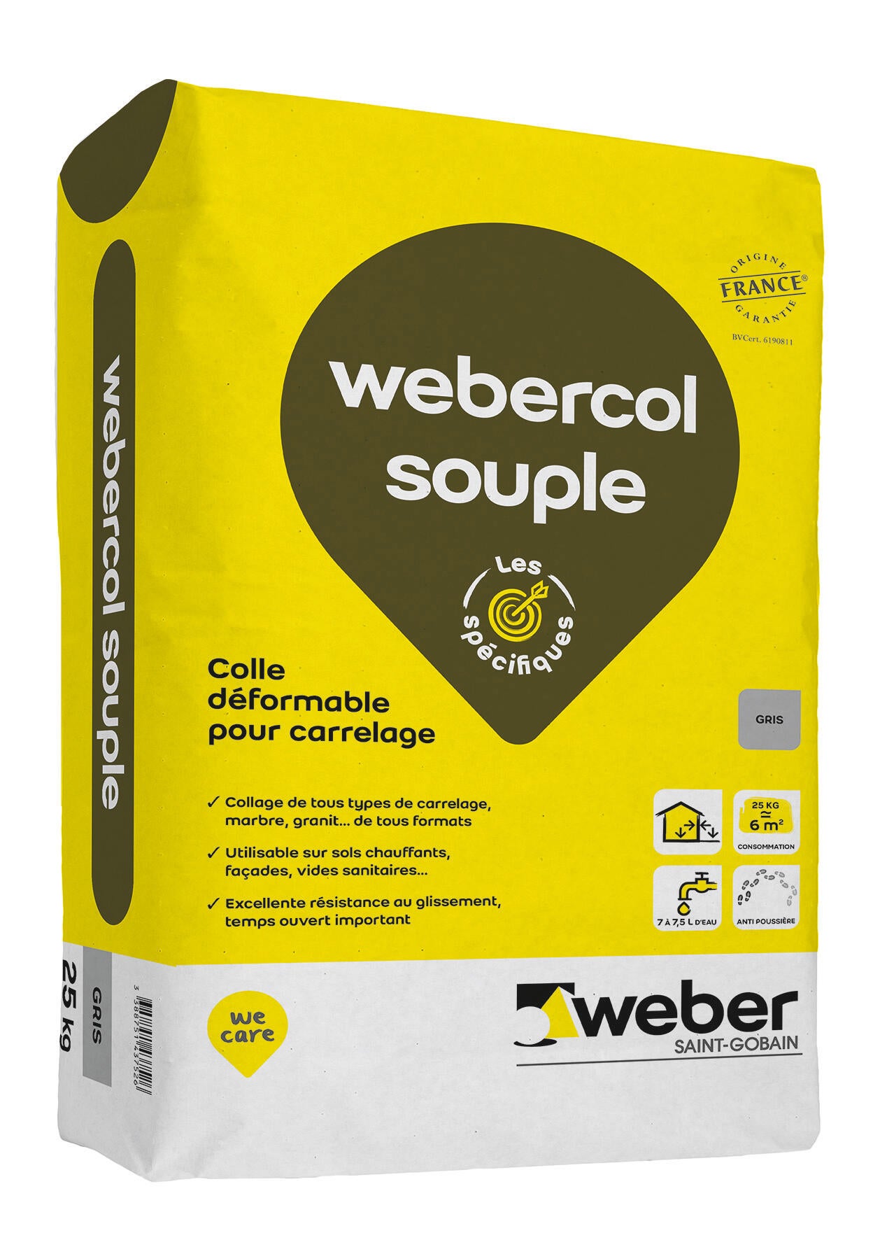 Mortier-colle déformable pour carrelage (C2S1 ET) pour la pose de carrelages et pierres naturelles (marbre, pierre calcaire, granit) de toutes porosités, de tous formats sur murs et sols intérieurs et extérieurs. Collage de tous types de carrelages, marbre, granit... de tous formats. Utilisable sur sols chauffants, façades, vides sanitaires. Pose de carreaux jusqu’à 10 000 cm² (1 m x 1 m). Formule anti-poussière Mention légales : Dangereux. Respecter les précautions d’usage.