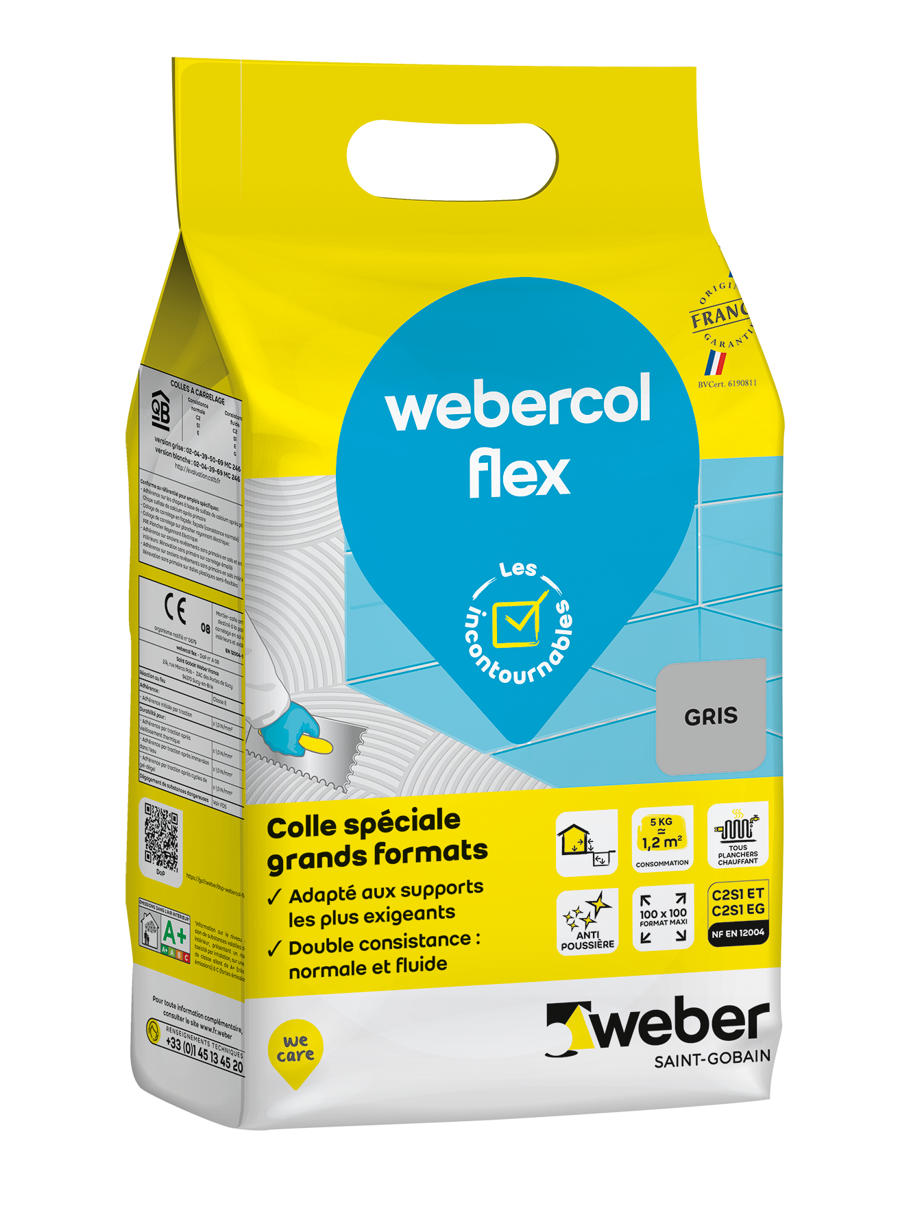 Colle carrelage en poudre gris C2S1ET pour sol et mur intérieur & extérieur 5 kg - Webercol flex WEBER