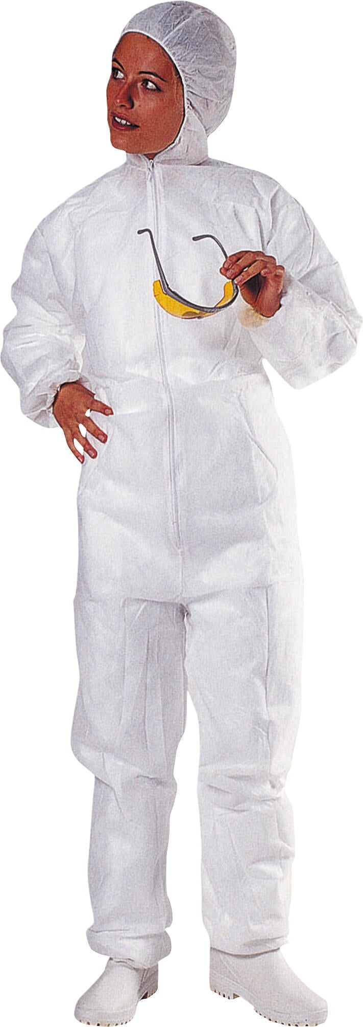 Combinaison avec capuche élastiquée. Polypropylène non tissé 35 g/m². Fermeture avec zip. Elastique de serrage à la taille, aux chevilles et aux poignets. Compatible alimentaire. Disponible de la taille M à XXL. EN ISO 13688:2013 Exigences générales pour les vêtements