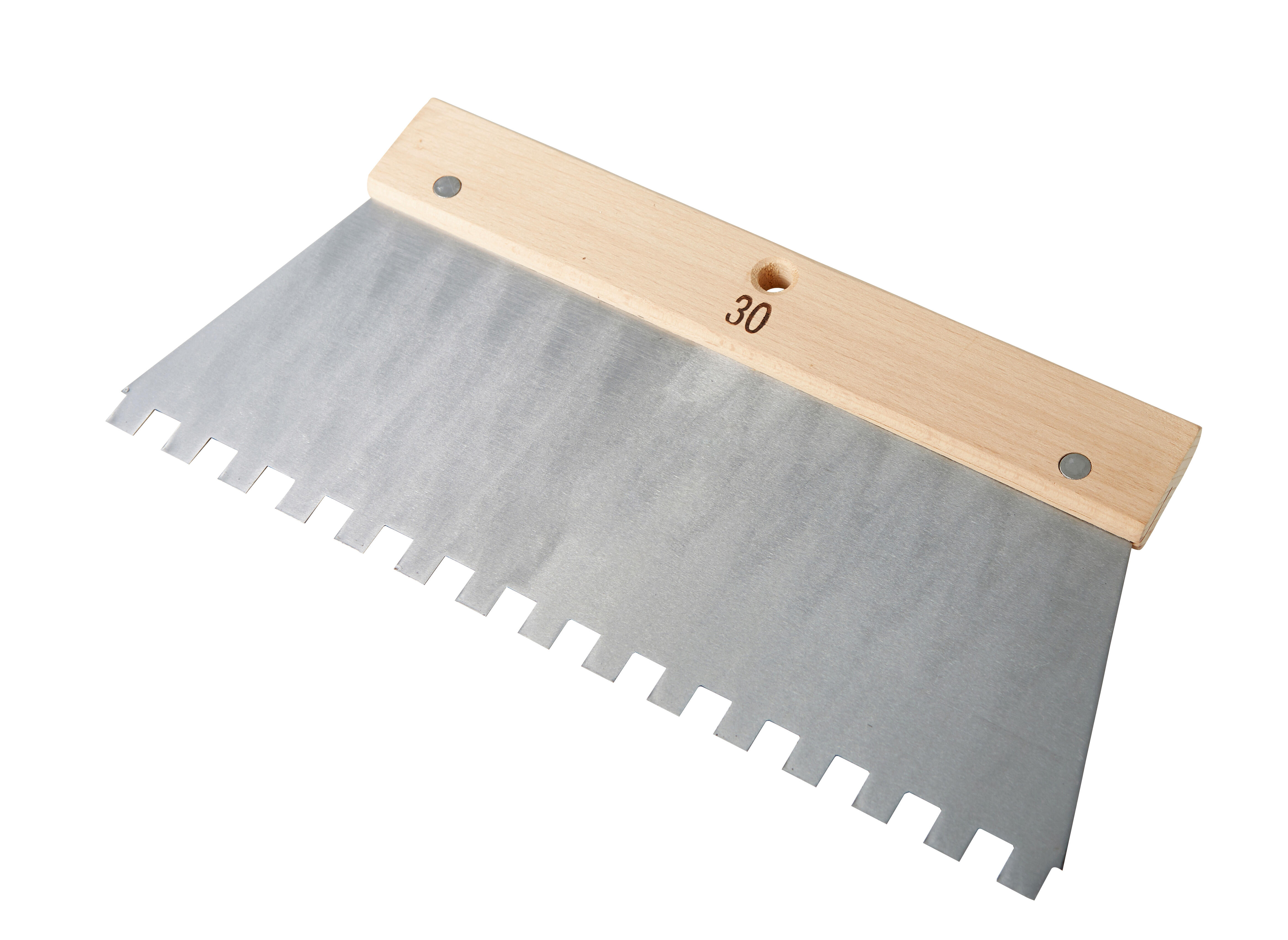 Spatule à colle, denture "U" 10x10 mm. Lame acier verni et manche en bois. Longueur : 30 cm.