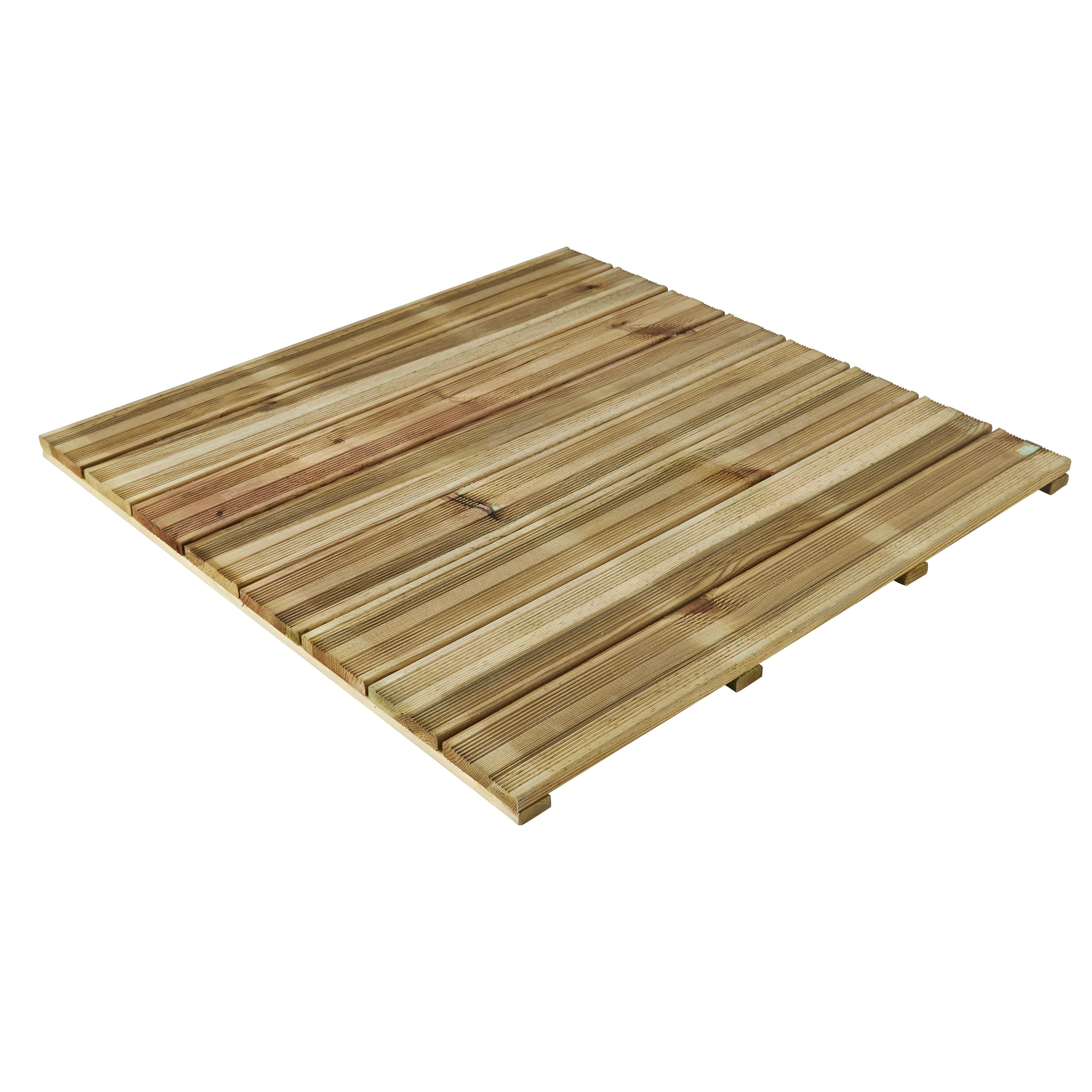 Dalle 100 x 100 cm. Traité autoclave classe 4. 8 lames larges profilées rainuré/lisse/rainuré. Espacement entre les lames : 5,8 mm. Assemblage par vis galva. Superficie de la dalle : 1 m². Nombre de dalles pour 1 m² : 1
