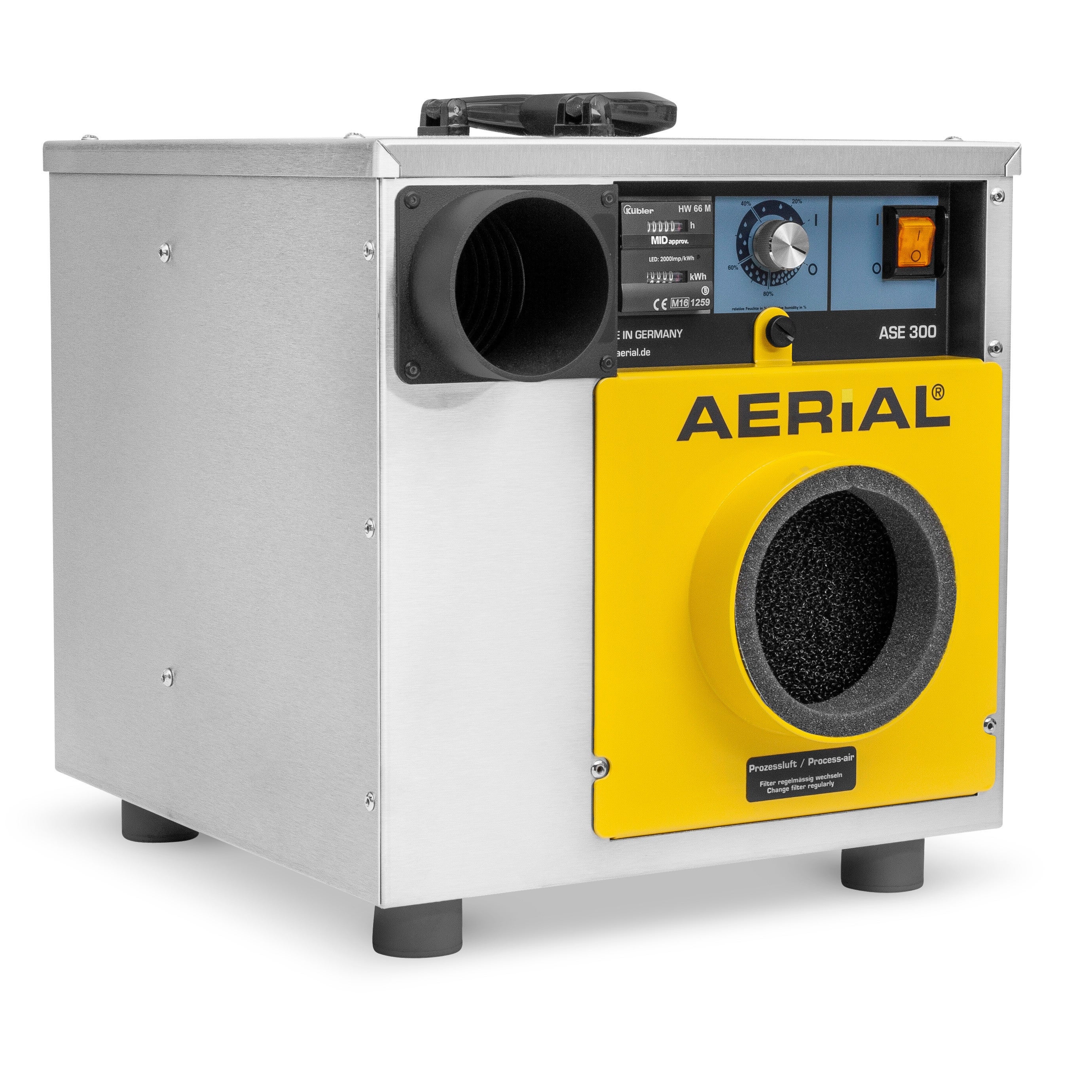 Déshumidificateur par absorption Sovelor ASE300 portable Monophasé pour Grands EspacesOptez pour le déshumidificateur par absorption Sovelor ASE300 pour une déshumidification efficace des grands espaces à basse température. Compact, robuste et léger, cet appareil offre des performances exceptionnelles, idéales pour le séchage rapide dans divers contextes de construction et d'urgence, minimisant ainsi les risques de dommages à long terme, tels que ceux causés par des inondations.Caractéristiques clés :Fonctionnement à basse température, de -10 à +35 °CCapacité de fonctionnement à faible humidité, jusqu'à 10 % d'humidité relativeUnité robuste en acier inoxydable et tôle d'acier à revêtement de poudre, avec quatre pieds en caoutchouc non marquantsConception ergonomique dotée de poignées pratiquesMoteur ECODRY G3 haute performance pour une absorption maximale de l'eauRotor amovible pour un entretien facileÉlément chauffant PTC dynamique, sûr et autorégulantVentilateur radial à haut rendement énergétiqueFiltre à air à l'entrée d'air traitéRéduction du bruit grâce au silencieux intégréCommandes Intuitives pour un Contrôle Précis :Bouton Marche/ArrêtHygrostat intégré pour un contrôle variable de l'humiditéCompteur d'heures de fonctionnement et d'énergie (homologué MID)Avantages :Affichage de la consommation d'énergie via un compteur énergétique étalonné, non réinitialisable, conforme à la norme MIDPrincipe d'adsorption avec un seul ventilateur commun pour l'air de traitement et de régénérationConvient aux environnements jusqu'à 300 m3, parfaitement combinable avec les séries Aerial AB et VPCaractéristiques Techniques :Capacité (20 °C/60 % HR) : 25,7 kg/24hVolume d'air - .