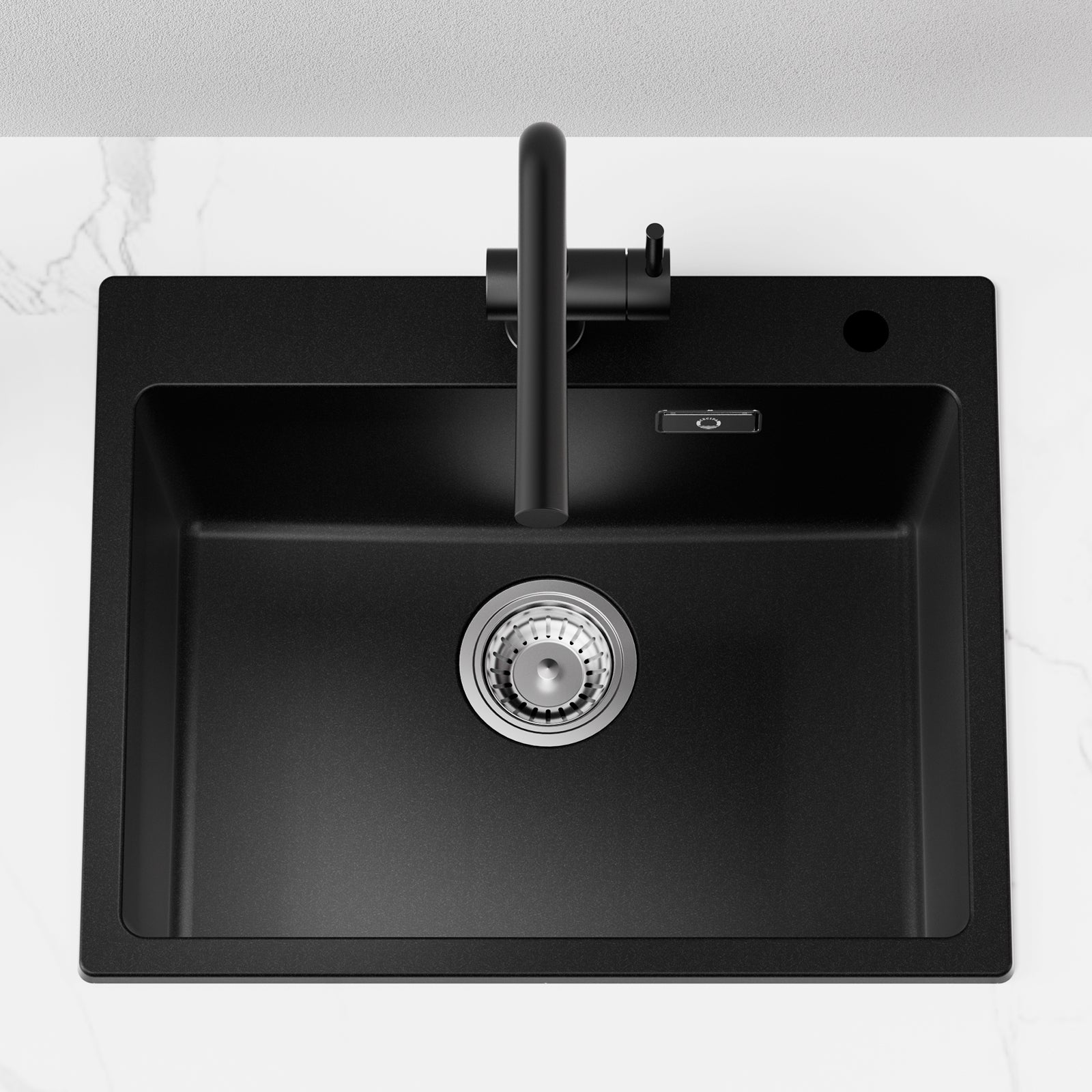 Évier Cuisine en Granit,55*45*20cm, Lavabo Cuisine1Bac,Kit de Vidage,Évier Cuisine en Acier Inox Encastré,Trous de Montage pour Robinet et Distributeur Savon,Noir