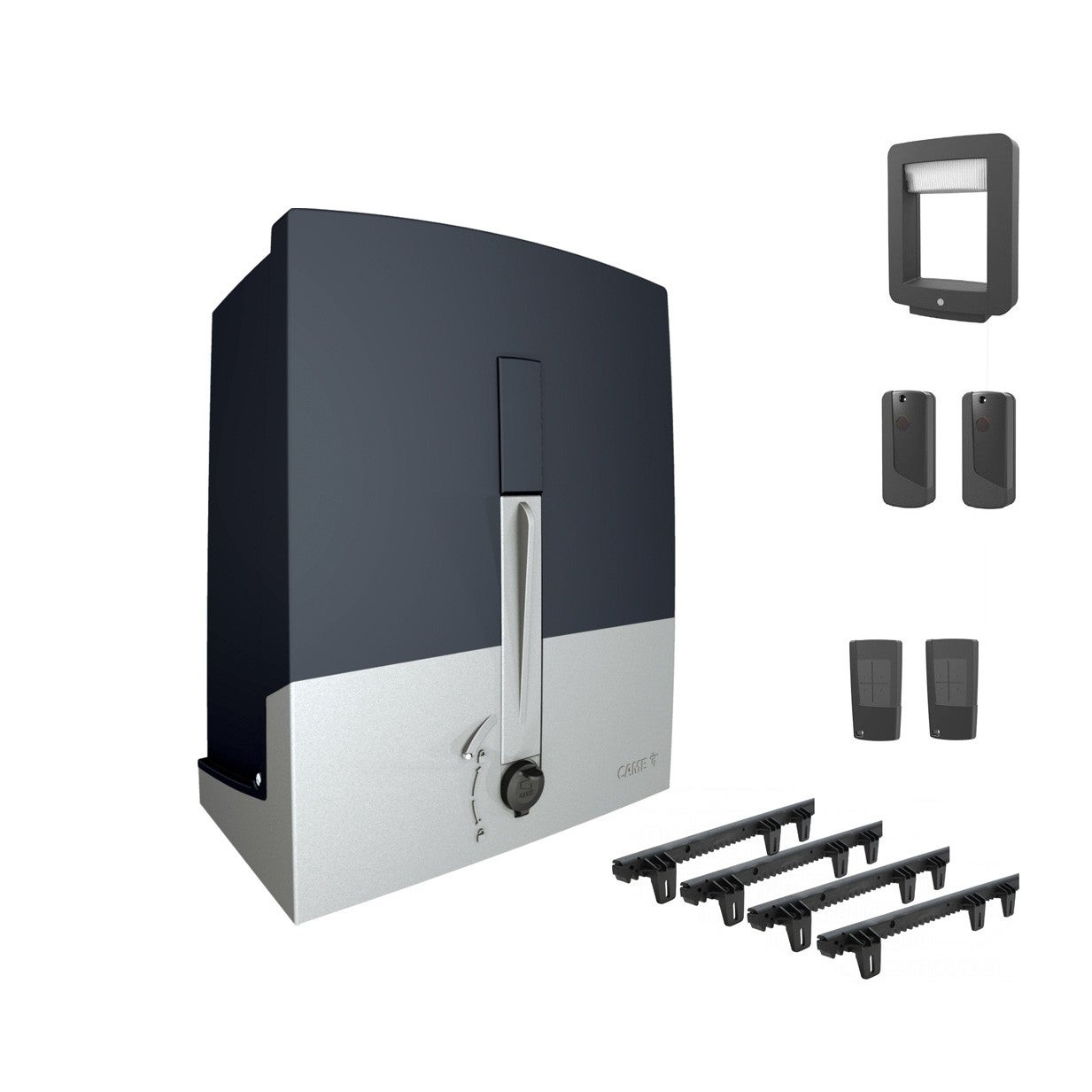Voir les produits de la même catégorieKit motorisation pour portail coulissant CAME avec 1 Télécommande 4 canaux et 4 crémaillères d'un mètre.Came est un fabriquant leader de motorisation de portail, profitez de cette offre pack incluant également 1 télécommande et 1 crémaillère pour vous équiper.Motorisation en 24V pour portail coulissant 001UOPS2000 - CAMECette motorisation CAME est étudiée pour assurer l'ouverture et la fermeture d'un portail coulissant de moins de 10 m ou d'un poids maximum de 400 kg. Equipé d'un moteur 24V, ce kit offre une sécurité de fonctionnement parfaitement adaptée pour un usage résidentiel ou collectif intensif.Confortablement installé dans sa voiture, l'ouverture du vantail coulissant s'effectue rapidement par le biais de la télécommande. Un mode piéton ou ouverture partielle sont également disponibles.Lors d'une panne d'alimentation électrique, ce kit complet dispose d'une fonction déblocage manuel, sinon une batterie de secours non incluse peut être ajoutée au moteur.Une motorisation fiable et sécuriséeCe kit CAME est une solution fiable pour motoriser son portail et protéger l'accès principal à l'habitation. Son système est doté d'un contrôleur de mouvement, d'une détection d'obstacles et de butées en fin de course pour une sécurité permanente. Différents réglages sont possibles au niveau de la vitesse de mise en fonction du vantail et sur les butées de fin de course. La présence d'un feu clignotant sert à prévenir les automobilistes comme les piétons de la mise en route du portail coulissant.L'installation de cette motorisation est simplifiée par la présence de pieds réglables et du socle pré-percé sur le moteur. L'armoire de commande ZN6 intégrée au moteur est facilement accessible pour un paramétrage rapide de l'équipement. La carte électronique protégée dans l'armoire vérifie en continu le bon fonctionnement du système et le désactive en cas d'anomalies détectéés.Avantages de la motorisation portail coulissant 001UOPS2000 - CAMEUTILISATION SIMPLEMode ouverture et fermeture par télécommandeMode piéton ou partielParamétrage rapide de l'équipementSÉCURITÉDétection d'obstacleDéblocage manuelContrôleur de mouvement intégréBatterie de secours en optionCarte électronique de protection et contrôle du systèmeCONDITIONS D'INSTALLATIONPieds réglables intégrésSocle pré-percéBranchement facilité du système avec armoire intégréAlimentation électrique 230 V à prévoir au préalableTélécommande 4 canaux CAME : Pilotez facilement vos automatismes CAMECette télécommande 001ATPD4 CAME permet de piloter plusieurs automatismes de la ligne BROWN LINE en utilisant au besoin 2 fréquences différentes sans aucun réglage. Compacte et sécurisée, elle est dotée d'un rolling code et gère l'ouverture et la fermeture de vos motorisations de portail. Nul besoin de changer la carte de fréquence d'un de vos automatismes, cet émetteur centralise ainsi la gestion de vos équipements CAME.Vous êtes prévenu du déchargement de la pile via le voyant LED.4 Crémaillères nylon P41180/054F AprimaticSpécialiste de la motorisation et de l'automatisme, le fabricant Aprimatic a conçu cette crémaillère nylon P41180/054F permettant le mouvement linéaire d'un vantail sur une motorisation de portail coulissant.Cette crémaillère est également composée d'un corps en acier, la rendant plus résistante et durable dans le temps. Elle est ainsi destinée à des portails plus lourds.Cette crémaillère nylon P41180/054F agit comme une roue, entraînant le portail à glisser dans le rail fixé au sol. Elle est présentée par segment de 1 mètre pour effectuer un montage en succession. Ce montage est simple à réaliser tout comme la pose de la crémaillère avec la motorisation.L'autre spécificité de cet équipement est d'être silencieux, offrant un confort auditif appréciable notamment en cas d'usage collectif et multiple.