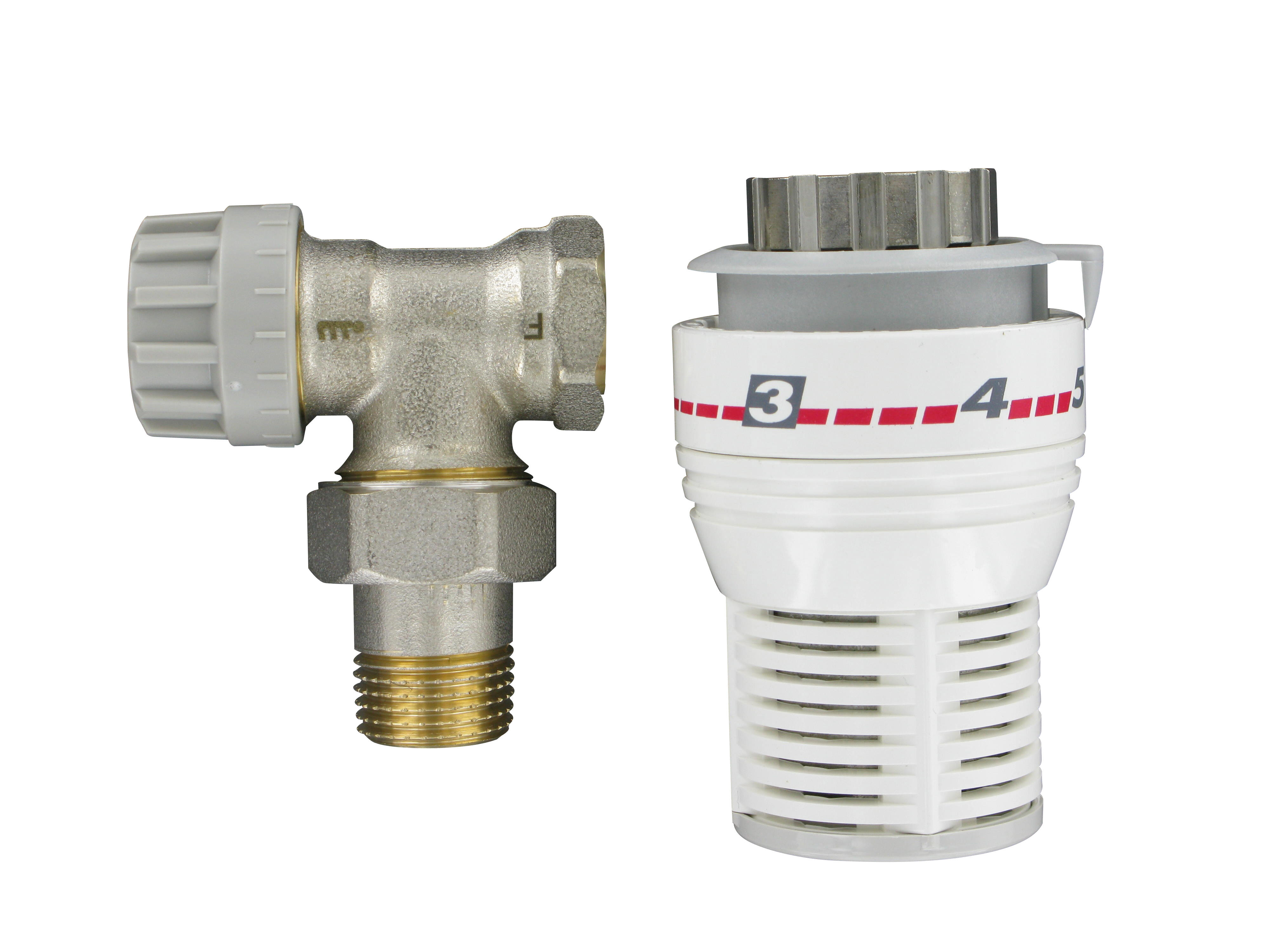Corps thermostatique équerre, Tête thermostatique, raccord de réglage, clé de purgeur, purgeur, robinet de vidange.
