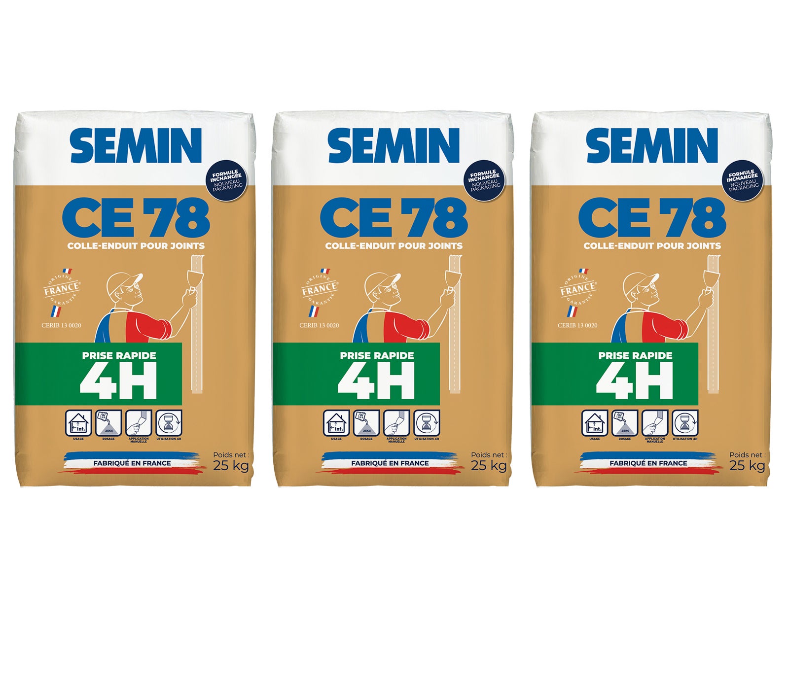 Lot de 3 enduits pour réaliser les joints de plaques de plâtre CE 78 Rapide Semin - temps de prise 4 heures - intérieur - sac de 25 kg