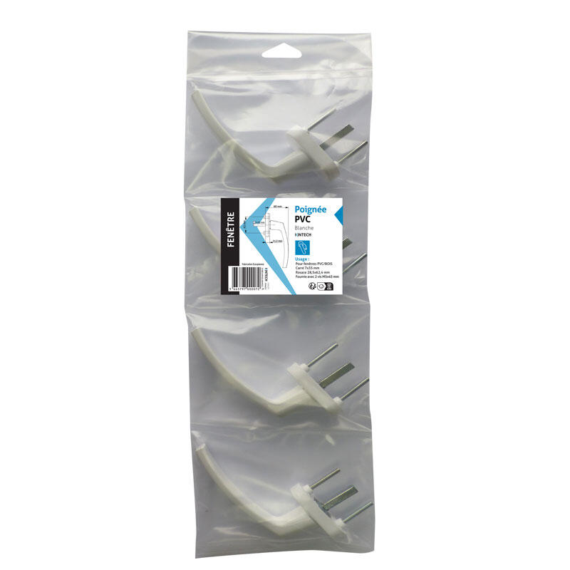 Poignée de fenêtre pour système de ferrure OF/OB. Matériau : PVC. Crantage 4 positions (90°) Carré (mm) : 7x35 Finition : Blanc Vis : M5x45 Durée présence pièces détachée : 2 Mention légales : -