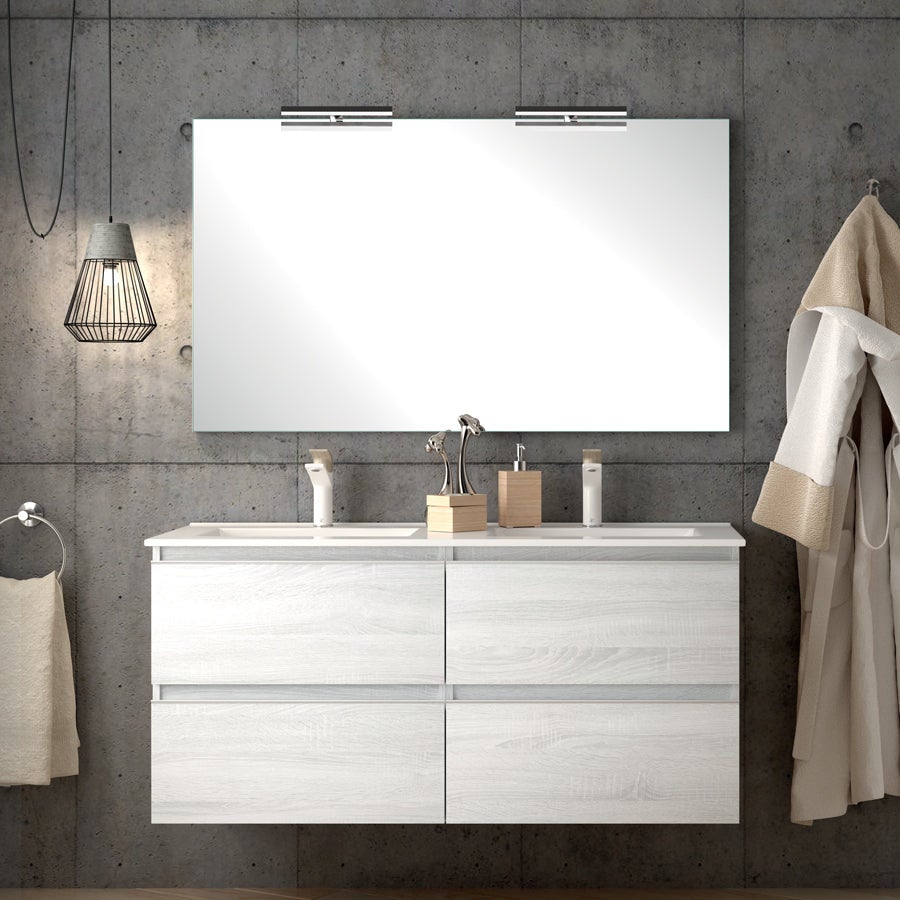 Le meuble de salle de bain 4 tiroirs BALEA - hibernian (bois blanchi) - 140cm est composé d'un meuble, d'un plan double vasque et d'un miroir avec applique. Il existe en 6 coloris et 6 dimensions ce qui lui permet de s'adapter parfaitement à votre salle de bain en fonction de vos envies.