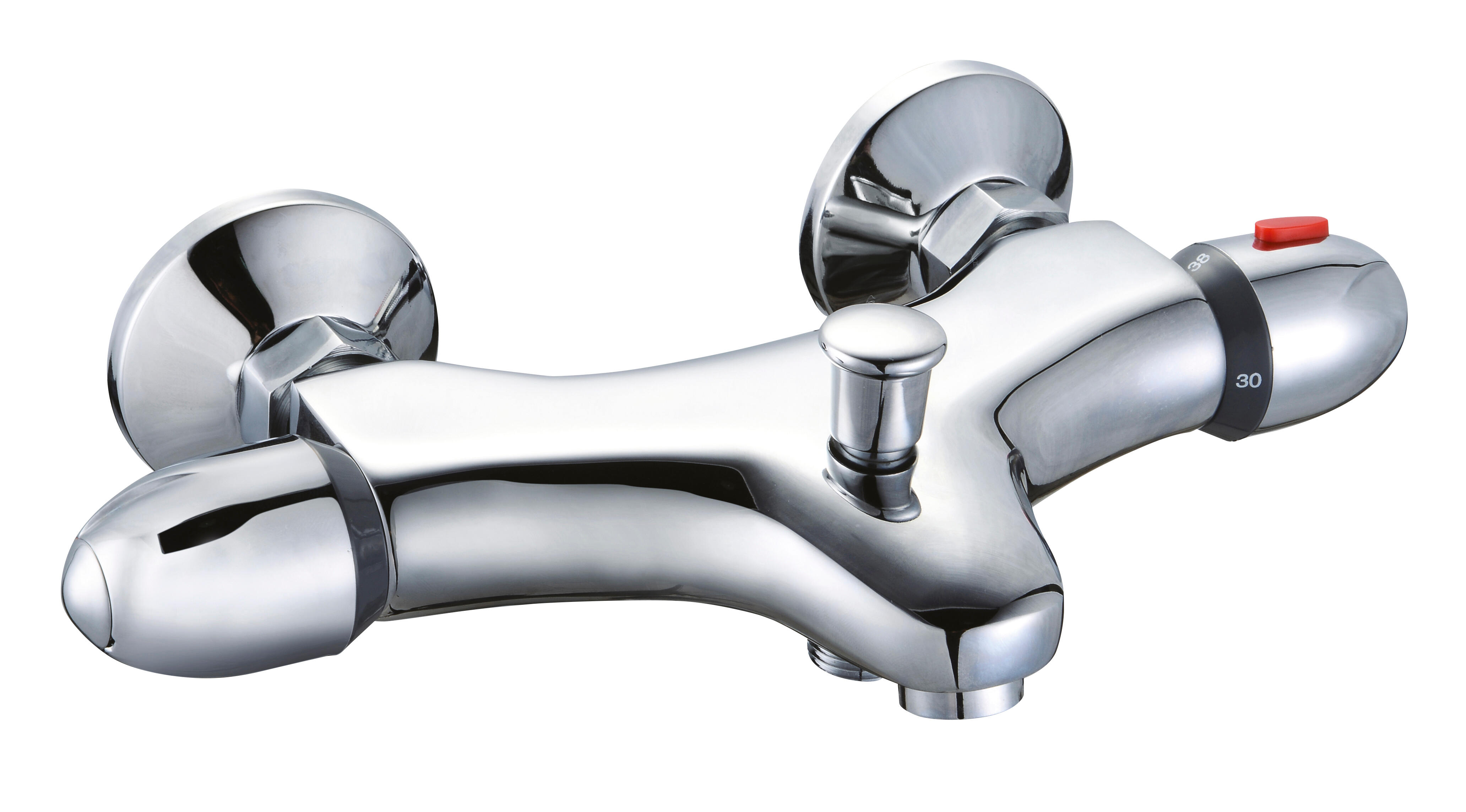 Mitigeur thermostatique de bain Chrome Cartouche Thermostatique Sécurité 38° Inverseur sur le bec Entraxe 15cm Fourni avec raccord et rosaces de la couleur du mitigeur Durée présence pièces détachée : 2 ans