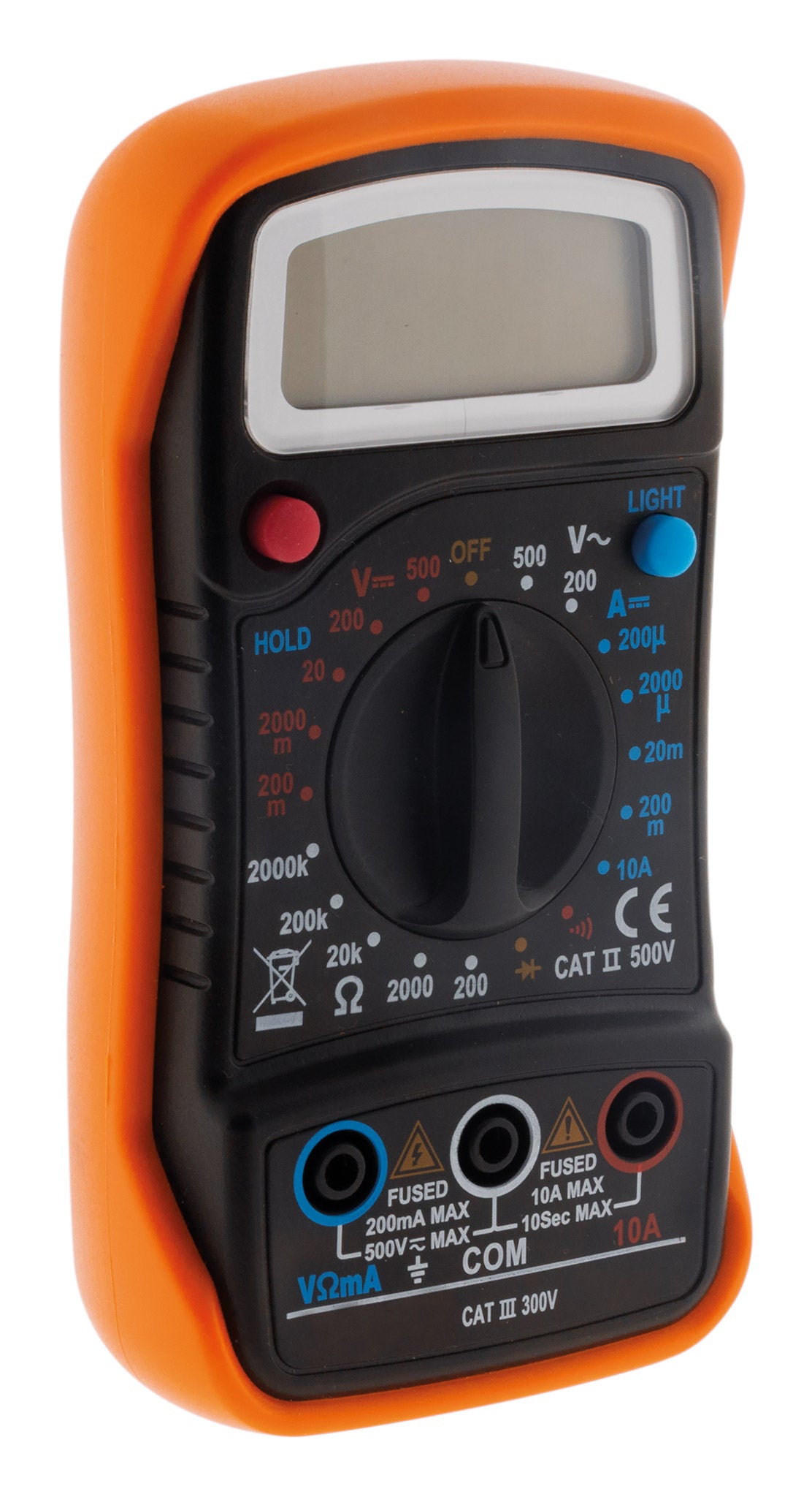 Ce multimètre digital CAT III est l'indispensable de la boîte à outils pour électricien. Il vous permet de mesurer le courant électrique : ampères, volts, ohms et est particulièrement utile pour détecter tous les problèmes électriques de la maison. Très résistant aux chocs, il vous accompagnera partout. Son support rabattable est très pratique pour pouvoir le maintenir à la verticale sans avoir à le tenir. Il dispose de 6 fonctions et 19 calibres et d'un affichage LCD clair et facile à lire. Il est livré avec deux piles AAA 1.5V et des pointes de touches. Son commutateur rotatif vous permet de choisir la sélection qui vous convient parmi les 20 positions disponibles. Certifié CE. Contenu: Multimètre digital, pointes de touche, 2 piles AAA 1.5V.