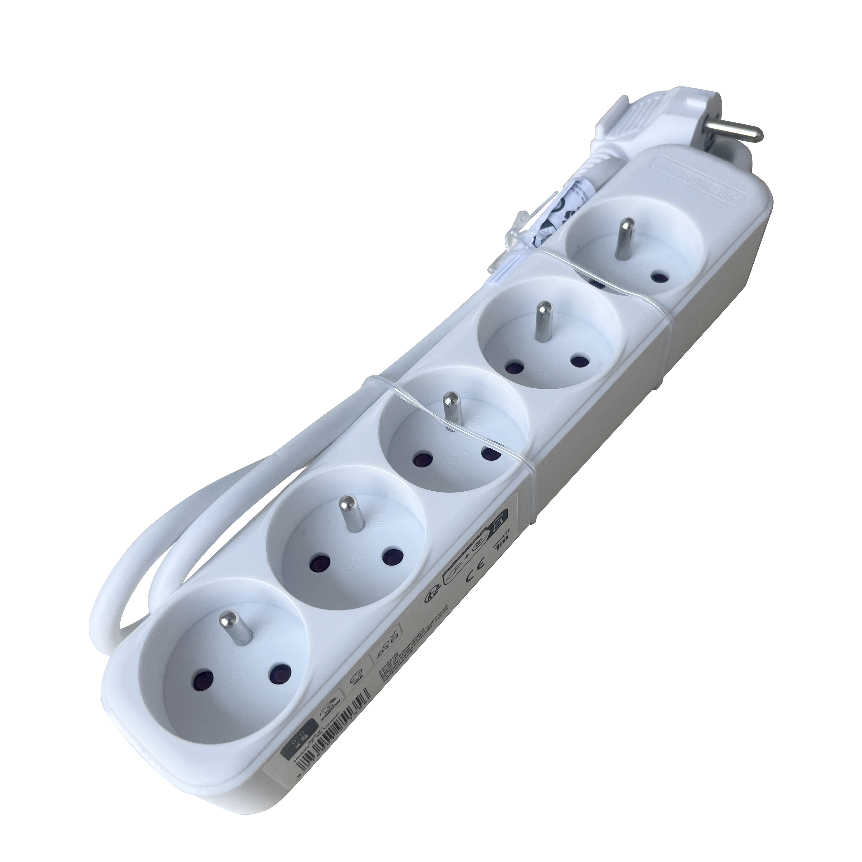 Multiprise rectangulaire de type E blanche sans interrupteur. Nombre de prises : 5. Longueur du câble : 1 m 3G1.0. Fiche classique.
