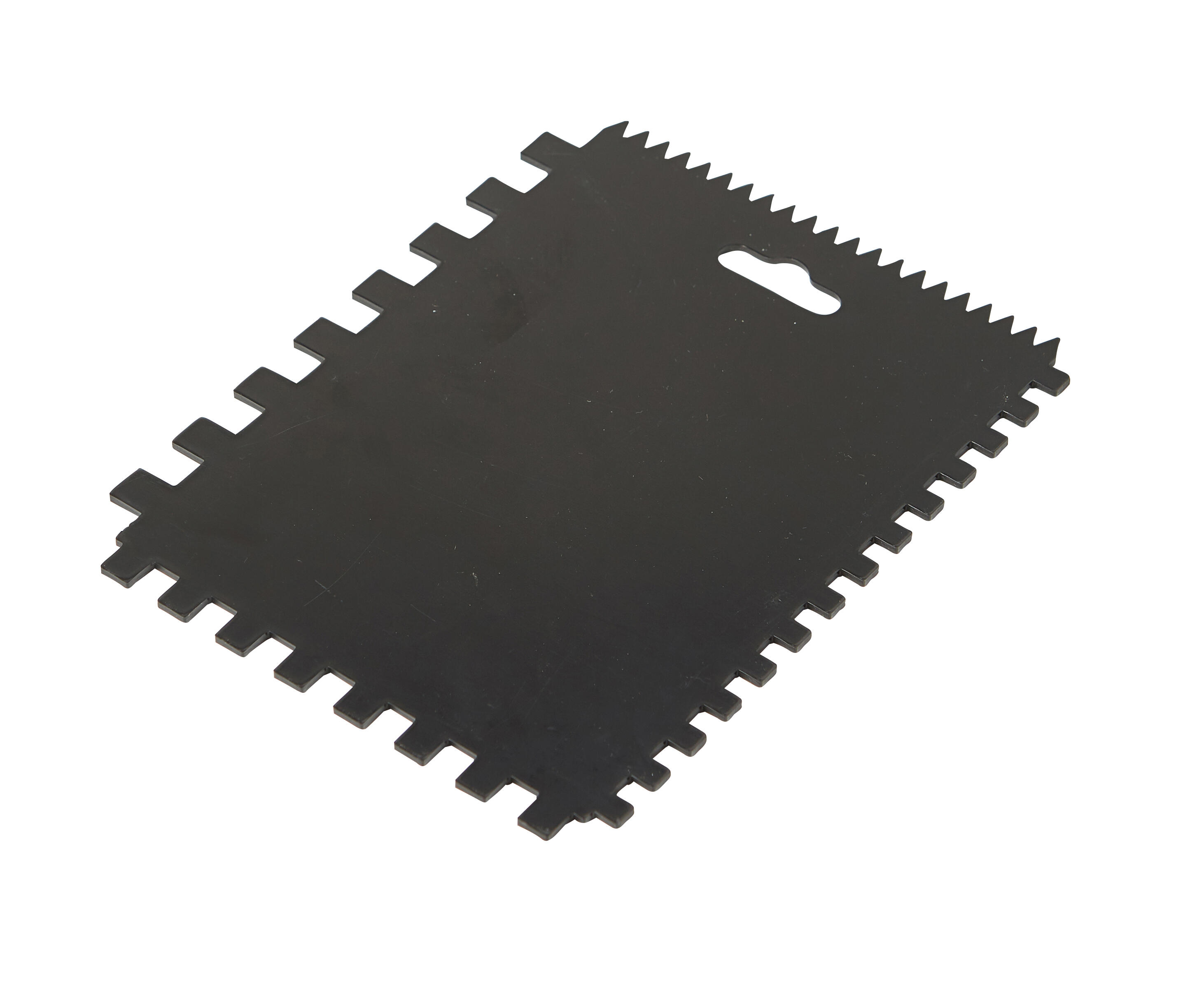 Peigne à colle "universel" qui permet l'encollage de différentes tailles de carreaux, grâce à ses 4 dentures : denture en "V" 6x6mm, denture en "U" 6x6mm, 8x8mm et 10x10mm. Pour carreau de 500 à 1100cm2. En plastique ABS.