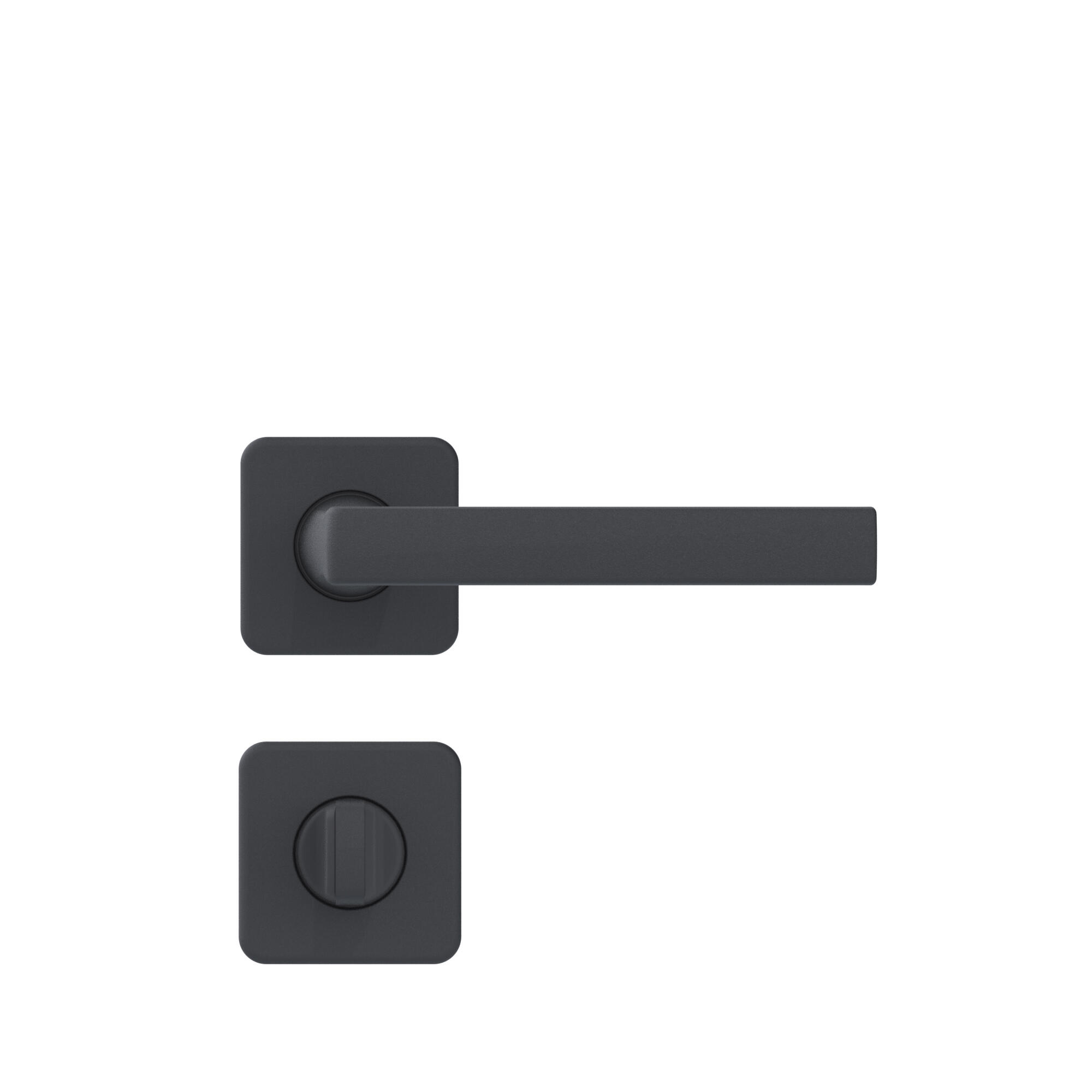Béquille en aluminium. Pack complet béquille double + rosace de béquille + rosaces de fonction. Sous-rosace en polyamide chargé en fibre de verre. fixation invisible. Finition BASALT : Noir mat finement texturée Carré de 7mm. Vis de fixation pré-montées. Fonction pour WC, salle de bain