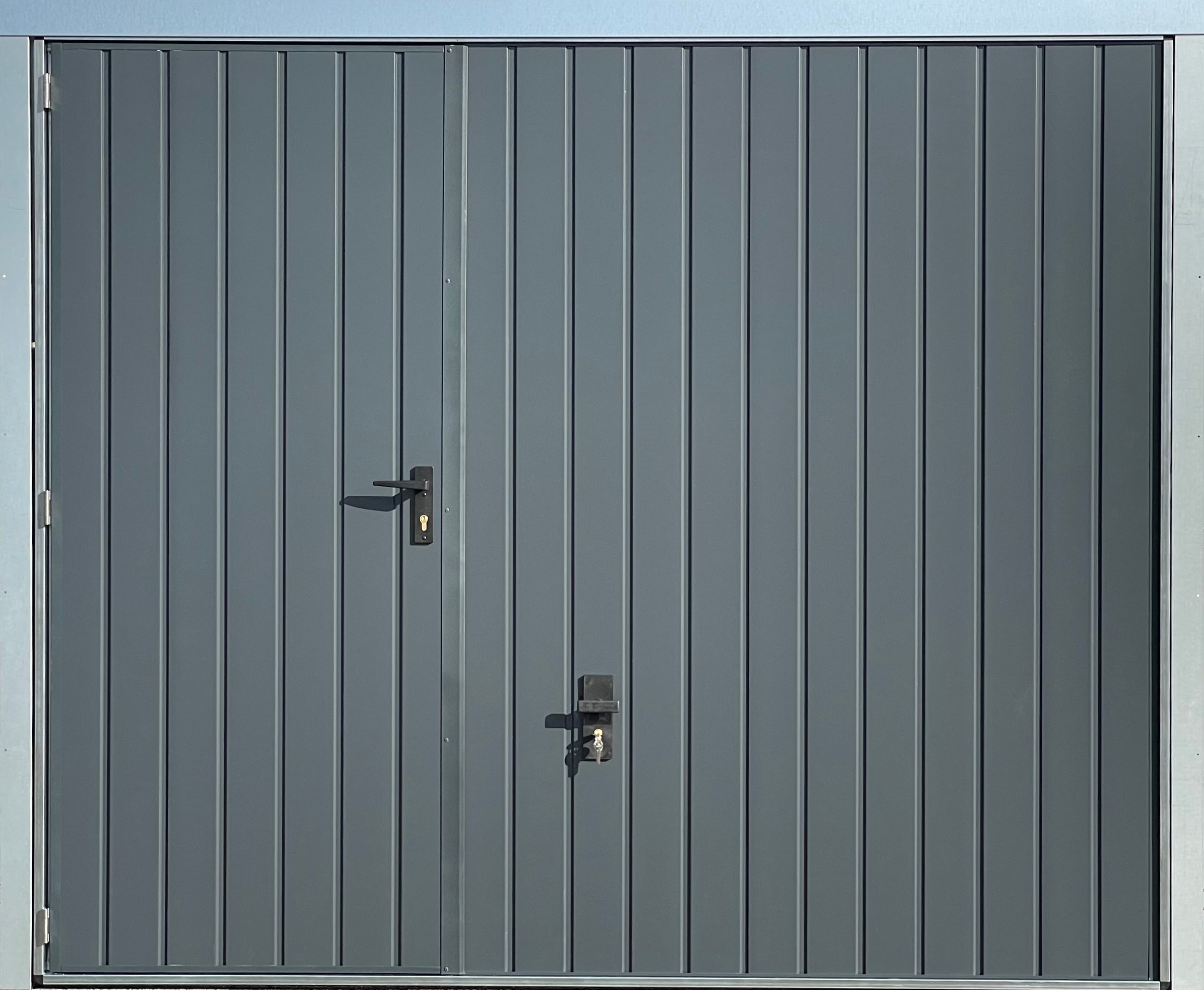 Le portillon est disposé à gauche vu de l'extérieur, a une largeur de 830mm et est équipé d'une serrure 1 point, pouvant être complétée en option par 2 verrous supplémentaires actionnables de l'intérieur. La porte de garage en elle-même est verrouillée avec 1 point de fixation central au sol. Les deux serrures (porte et portillon) sont verouillées par la même clé.