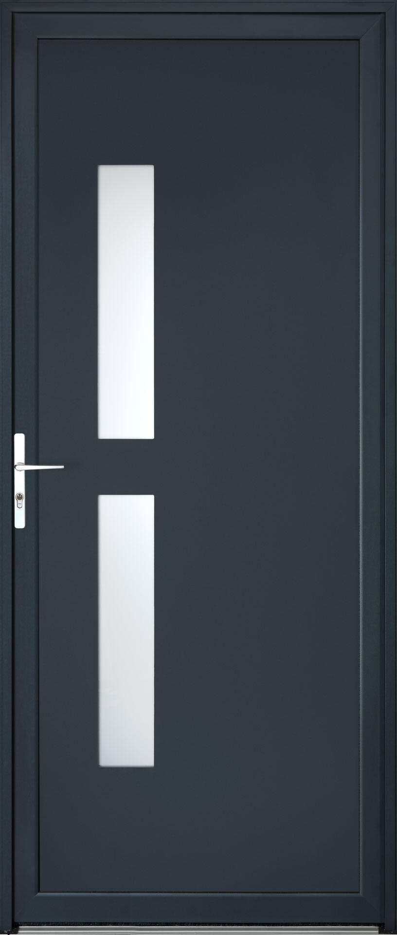 Porte de service aluminium ASPIN poussant Droite, avec 2 vitrages de 22 mm d'épaisseur superposés, coloris gris RAL 7016 satiné interieur et exterieur, dimension 215cm par 90 cm côte tableau, seuil RPT, crémone à relevage 4 points. Durée présence pièces détachée : 2