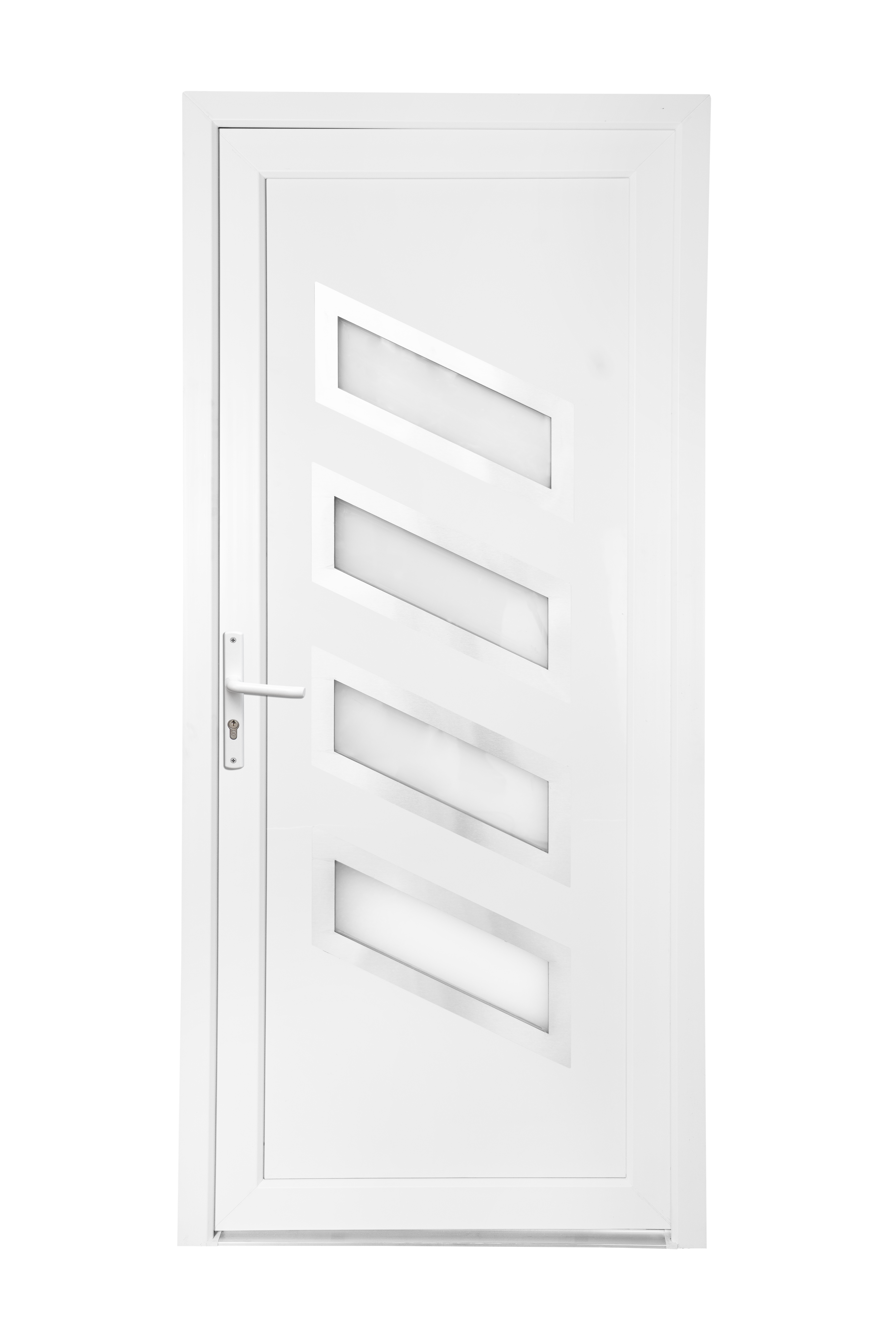 PVC blanc traité anti-UV. INOX Panneau 24 mm Mousse isolante.Ouvrant 60 mm Seuil aluminium. Vitrage GRANITE.Serrure 5 points Paumelles réglables 3D Durée présence pièces détachée : 5 ans Mention légales : Poignées et barillets vendus séparément.