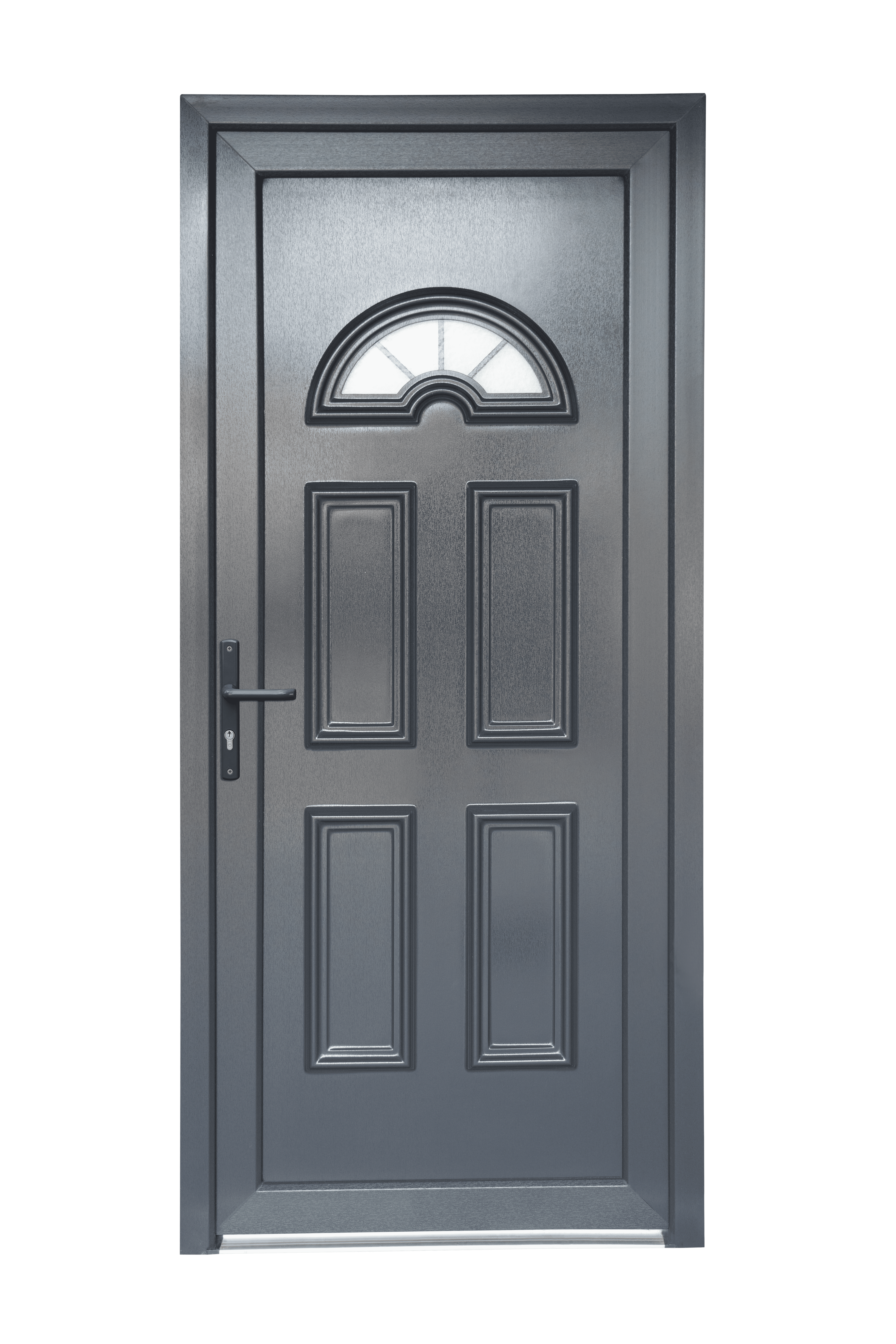 PVC GRIS RAL 7016. Panneau 24 mm mouluré 2 faces. Mousse isolante. Ouvrant 60 mm ,Seuil aluminium. Vitrage GRANITE.Serrure 5 points Paumelles réglables 3D Durée présence pièces détachée : 5 ans Mention légales : Poignées et barillets vendus séparément.