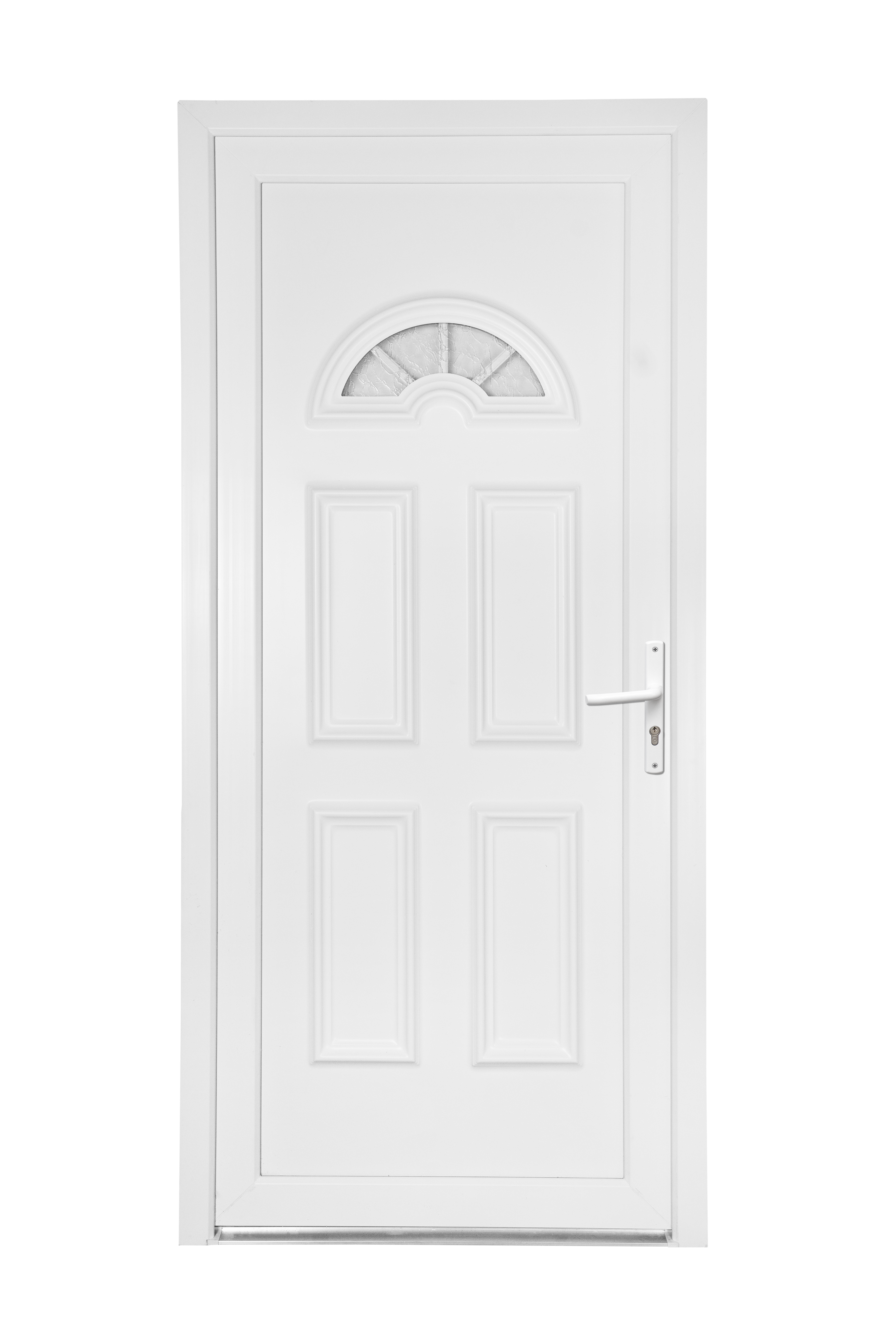 PVC blanc traité anti-UV. Panneau 24 mm mouluré 2 faces. Mousse isolante.Ouvrant 60 mm Seuil aluminium. Vitrage GRANITE.Serrure 5 points Paumelles réglables 3D Durée présence pièces détachée : 5 ans Mention légales : Poignées et barillets vendus séparément.