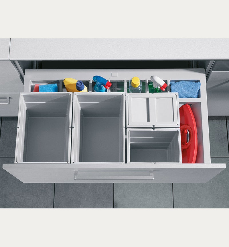 Avantages et points forts de la poubelle encastrable Separato K 900 50Loe Facile à nettoyer et à vider car les quatre bacs intérieurs de 2x18L et 2x8L sont amovibles.