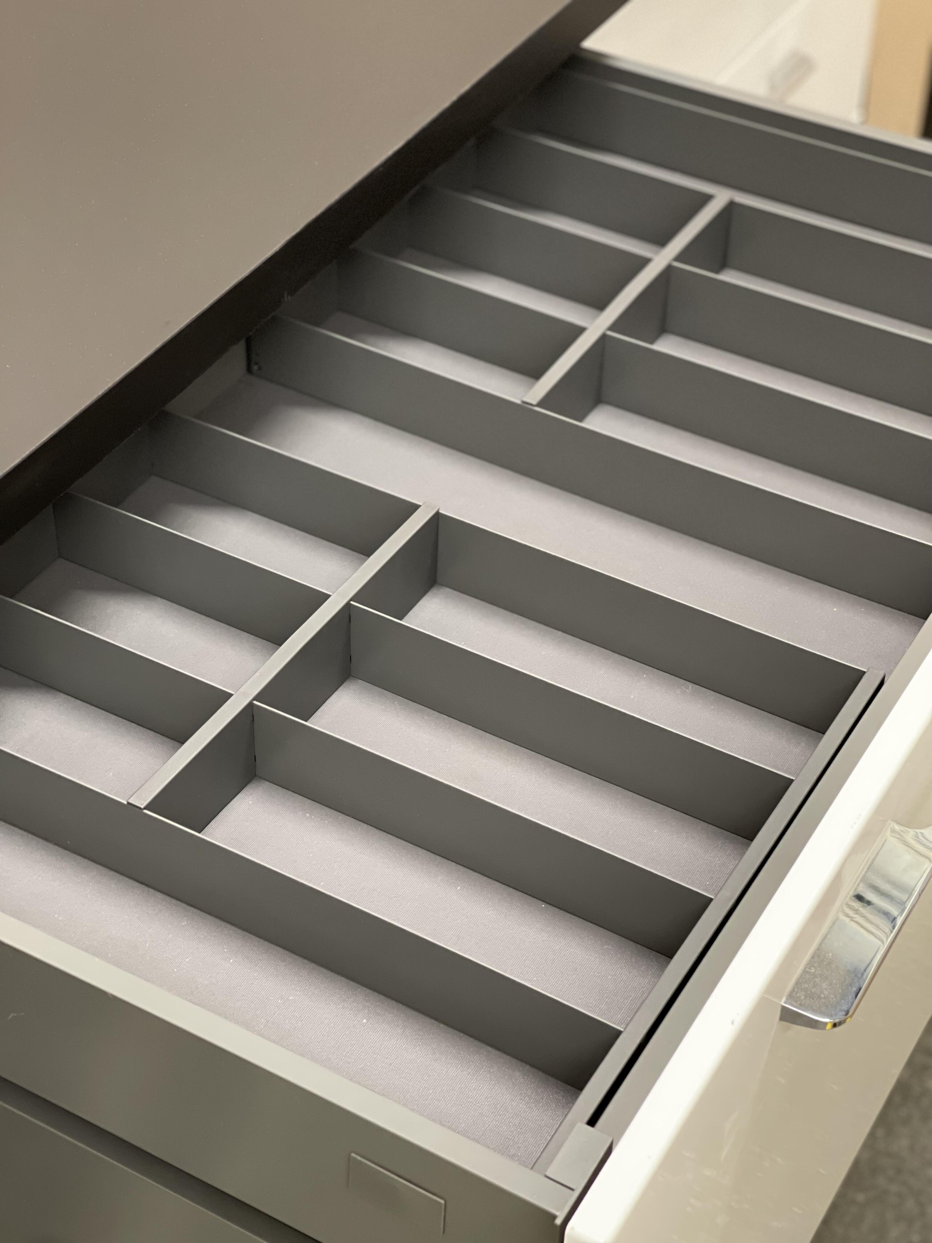 Nouvelle génération de range-couverts universels s’adaptant aux Tiroirs SLIMPRO ainsi qu’à la grande majorité des tiroirs de cuisine. Le range-couverts universel MODULAR permet d’organiser le rangement des tiroirs de façon optimale et flexible. Utiliser 1 seul range-couverts pour les tiroirs en largeur de 450 mm et 600 mm A partir d’un tiroir de 900 mm de large, utiliser 2 range-couverts. Selon les ustensiles de cuisine que vous possédez, vous pouvez moduler selon vos besoins, les espaces en positionnant différemment le ou les range-couverts à l’intérieur du tiroir afin de modifier la largeur des alvéoles restantes. Conception robuste en Acier et Plastique gris anthracite pour une harmonie parfaite avec le tiroir.