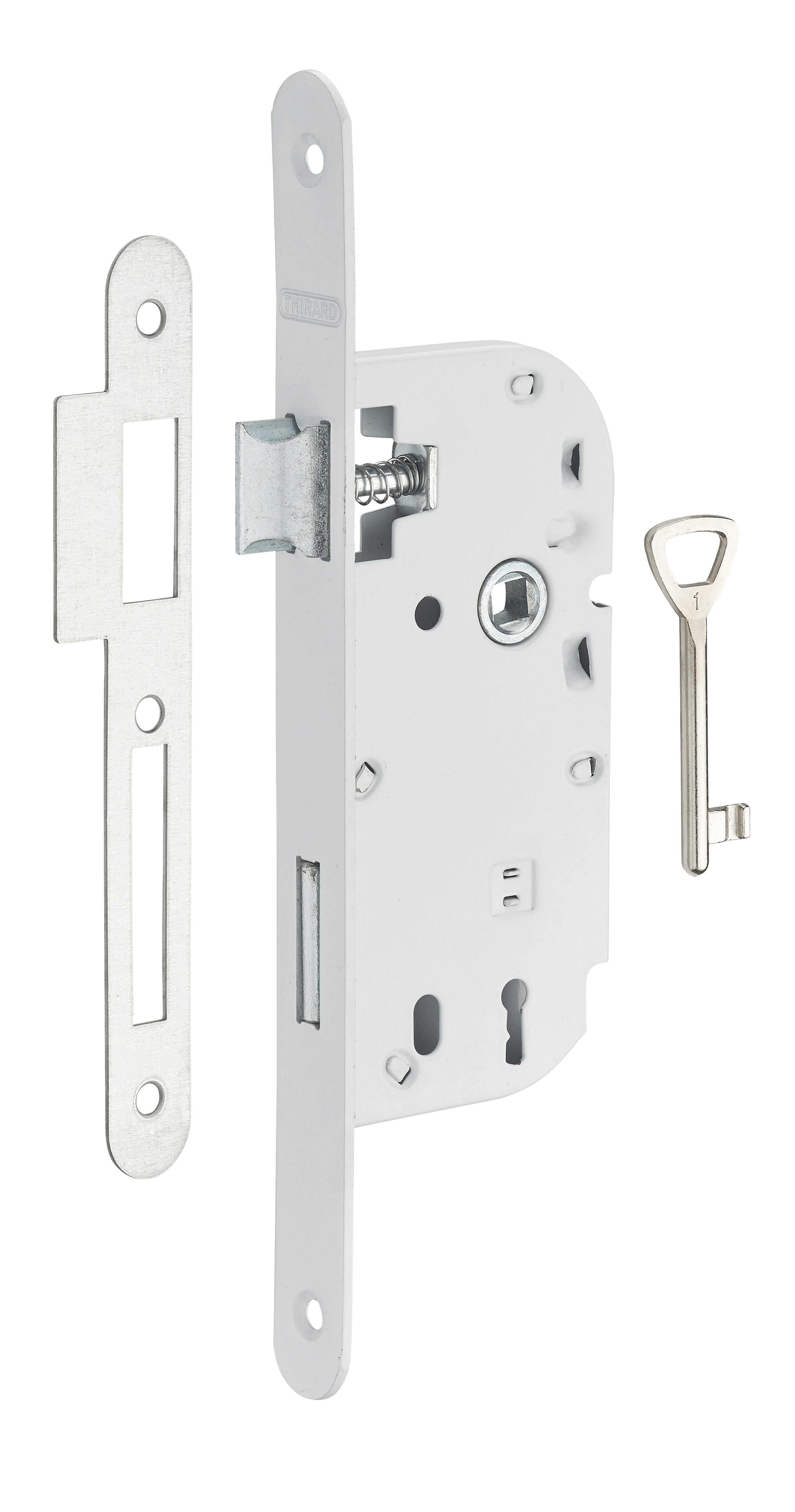 Coffre acier embouti. Têtière acier. Demi-tour alliage réversible sans démontage du coffre. Pêne acier. Gâche plate acier. Mécanisme à 1 tour. Carré 7 mm, entr’axe 70 mm. 1 clé. 6 variures, Epoxy blanc - Têtière bouts ronds. pour porte isoplane < 40 kg, (NON GARANTIE EN CAS DE CONTRE BEQUILLAGE)