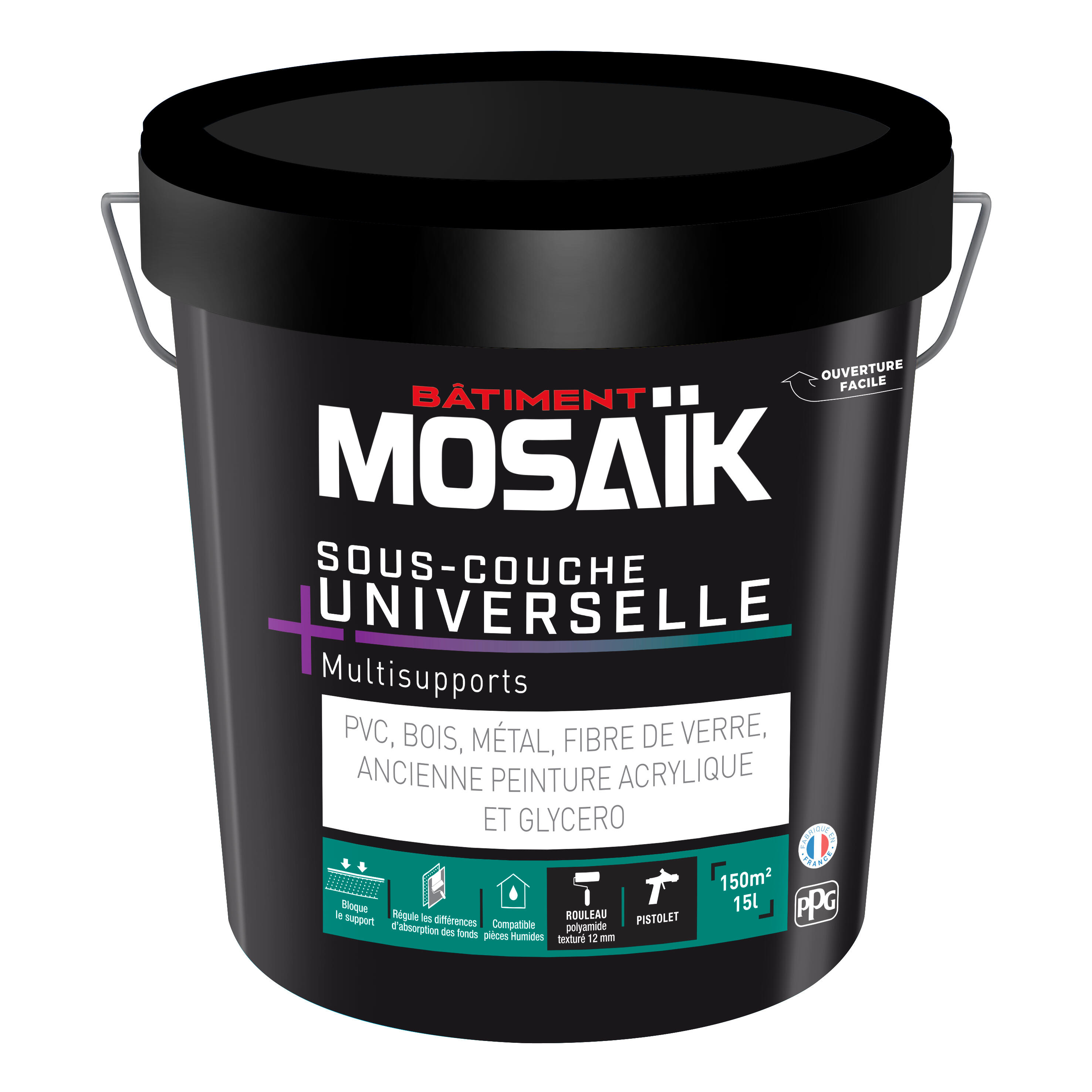 Sous-couche universelle acrylique de qualité professionnelle. Idéale pour préparer les travaux de finition, en intérieur, sur PVC, bois, métal, fibre de verre, dalles de polystyrène, ancienne peinture acrylique et glycéro. Très opacifiante, cette sous-couche régule les différences d’absorption des fonds et favorise l’accroche de la peinture de finition. > Universelle > Multisupports (PVC, bois, métal, fibre de verre, ancienne peinture acrylique et glycéro) > Régule les différences d'absorption des fonds > Bloque le support > Compatible pièces humides > Bonne opacité > Séchage rapide pour un chantier dans la journée > Fabriqué en France Fort de plus de 10 ans d'expertise, MOSAIK Batiment vous accompagne avec des produits de qualité professionnelle dans tous vos projets intérieurs et extérieurs. MOSAIK Batiment couvre tous les segments et vous propose des produits de qualité bâtiment au meilleur prix. Mention légales : -