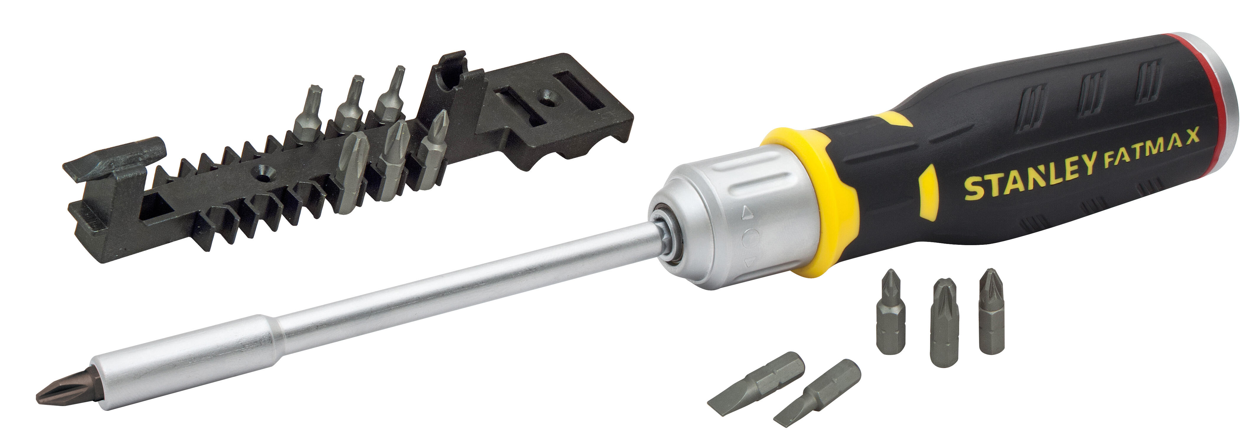 Tournevis porte-embout à cliquet + 12 embouts et ratelier. Mécanisme à cliquet de 40 dents pour un usage professionnel (3 fois la capacité humaine). Stockage de 12 embouts dans le manche. 3 positions : vissage, dévissage et blocage. - Composition : Fente 4 - 5.5 - 6 mm / PH1 - PH2 - PH3 / PZ1 - PZ2 - PZ3 / T10 - T15 - T20. Durée présence pièces détachée : Ce produit ne dispose pas de pièces détachées