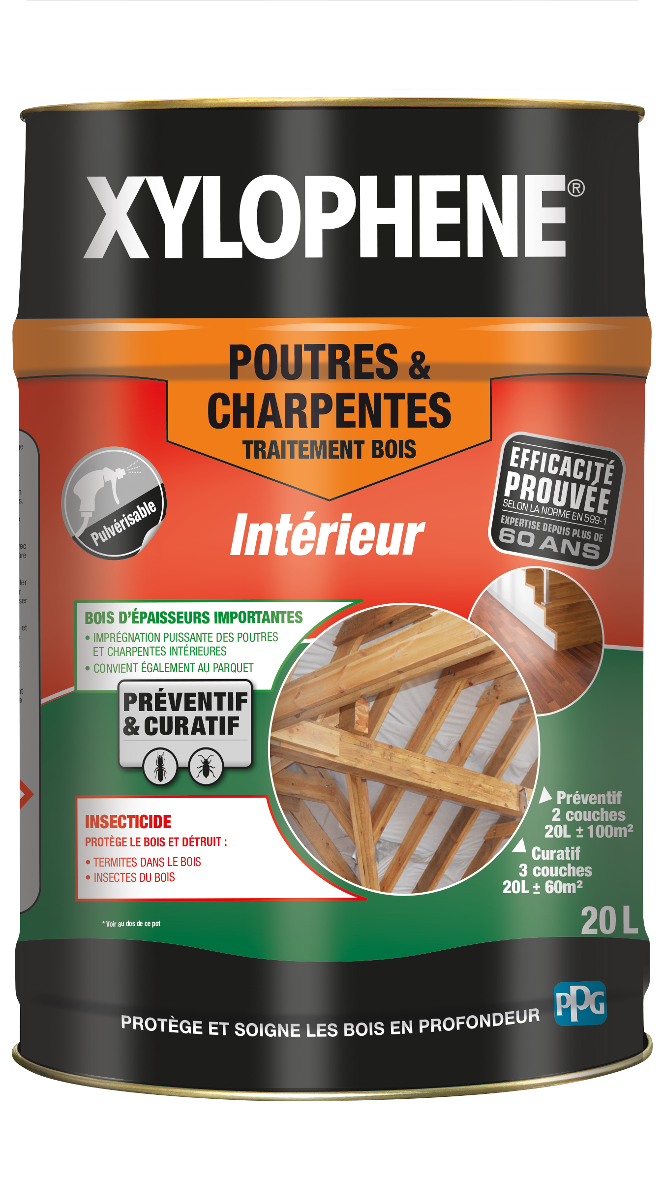 Intérieur. Produit de Traitement Préventif et Curatif pour Protéger et Soigner en profondeur les Poutres et les Charpentes - Insecticide et Anti-Termites - Spécial Bois d'épaisseur importante - Imprégnation puissante des Poutres, Charpentes Intérieures et Parquets - Prêt à l'emploi. • Produit de TRAITEMENT pour POUTRES et CHARPENTES • Insecticide et Anti-termites • Protège le Bois et Détruit les Termites, Insectes, Capricornes, Lyctus, Vrillette • Préventif et Curatif • Incolore • Rendu optimal et efficacité prouvée - Xylophene est l'expert du traitement des bois depuis plus de 60 ans Séchage rapide, 48 h avant apllication d'une finition. Rendement ± 5 m²/L bois sains ; ± 3 m²/L bois attaqués. Du parquet à la charpente, des volets aux meubles, le bois est un patrimoine précieux que vos clients veulent protéger contre les attaques des insectes ou champignons. Expert du traitement du bois depuis plus de 60 ans et leader du marché français, XYLOPHENE propose une solution efficace et performante adaptée à chaque problématique. Mention légales : Dangereux. Respecter les précautions d’usage.