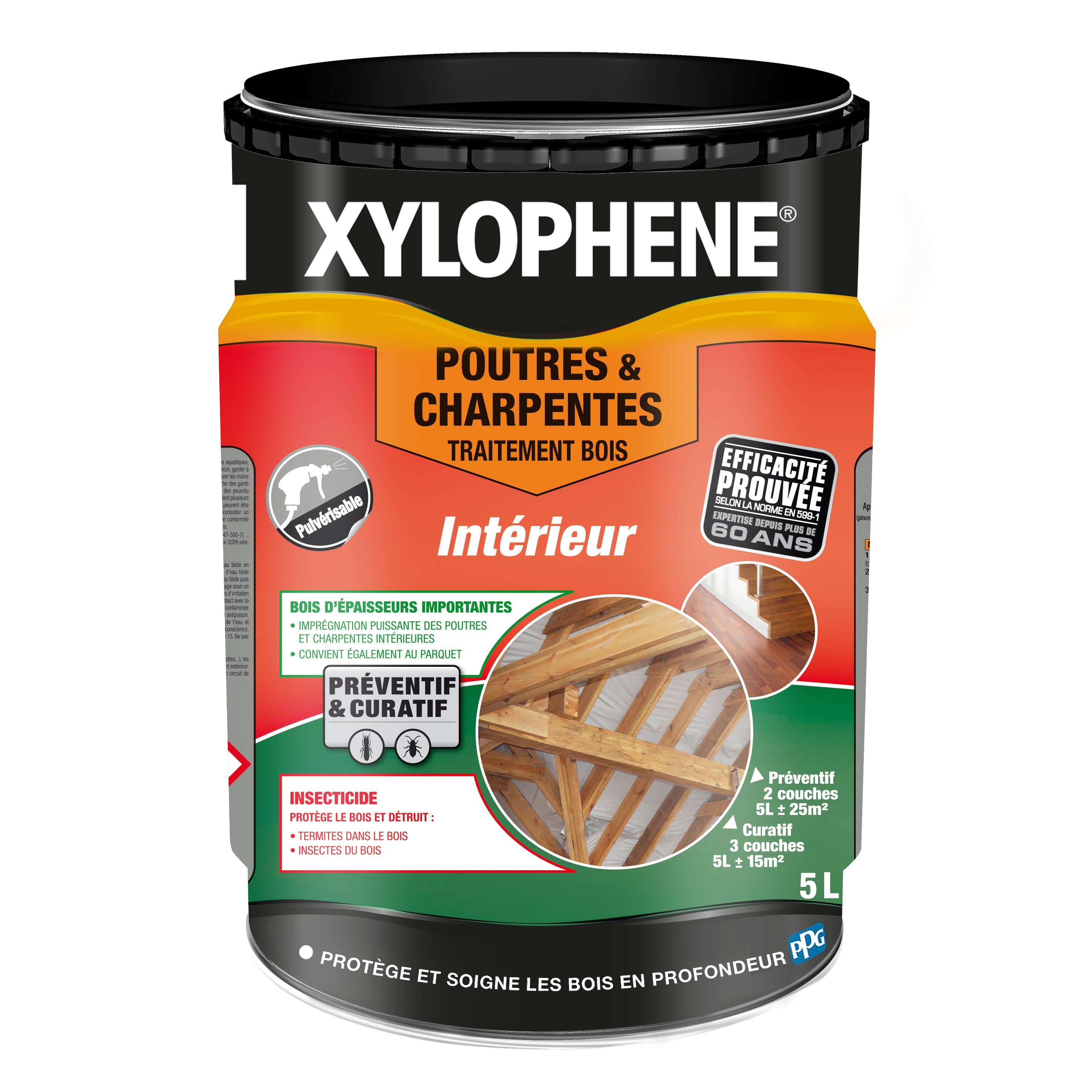 Intérieur. Produit de Traitement Préventif et Curatif pour Protéger et Soigner en profondeur les Poutres et les Charpentes - Insecticide et Anti-Termites - Spécial Bois d'épaisseur importante - Imprégnation puissante des Poutres, Charpentes Intérieures et Parquets - Prêt à l'emploi. • Produit de TRAITEMENT pour POUTRES et CHARPENTES • Insecticide et Anti-termites • Protège le Bois et Détruit les Termites, Insectes, Capricornes, Lyctus, Vrillette • Préventif et Curatif • Incolore • Rendu optimal et efficacité prouvée - Xylophene est l'expert du traitement des bois depuis plus de 60 ans Séchage rapide, 48 h avant apllication d'une finition. Rendement ± 5 m²/L bois sains ; ± 3 m²/L bois attaqués. Du parquet à la charpente, des volets aux meubles, le bois est un patrimoine précieux que vos clients veulent protéger contre les attaques des insectes ou champignons. Expert du traitement du bois depuis plus de 60 ans et leader du marché français, XYLOPHENE propose une solution efficace et performante adaptée à chaque problématique. Mention légales : Dangereux. Respecter les précautions d’usage.