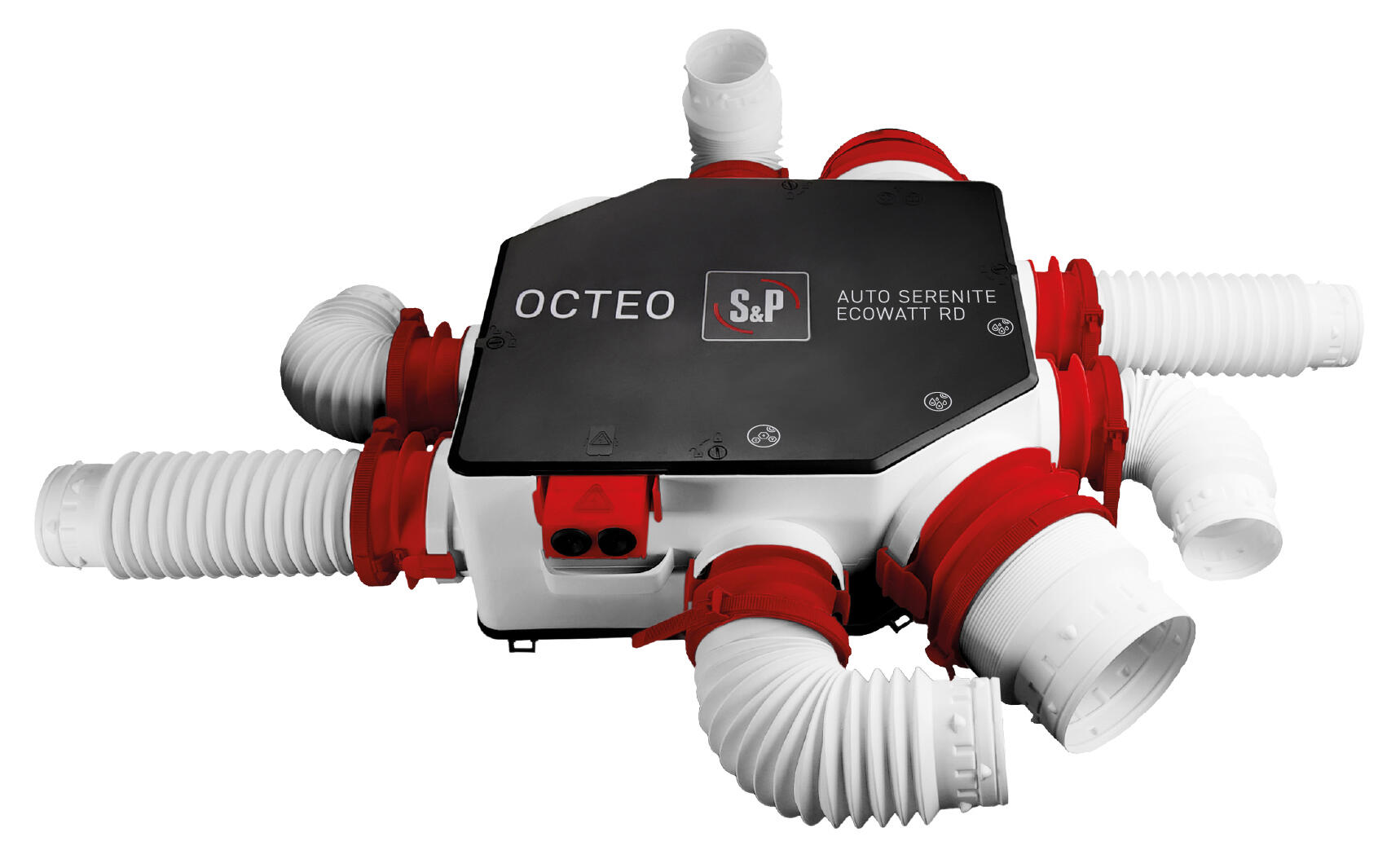VMC simple-flux autoréglable pour tous chantiers, installation ultra-rapide, simple & durable avec ses systèmes OCTEO®POWERTWIST, OCTEO®POWERFIX & OCTEO®POWERCONNECT. Du T1 au T7 jusqu'à 6 sanitaires. Traite la QAI de l'ensemble du logement grâce à 2 sondes d'humidité (cuisine et SdB), 1 sonde COV (WC) et 1 sonde radio de QAI (séjour). Le kit contient 5 entrées d’air filtrantes, 4 bouches extra-plates (3x 80mm, 1 x125mm), 1 commande boost radio et 1 plaque de support pour montage mural ou plafond. Durée présence pièces détachée : ce produit ne dispose pas de pièce détachée