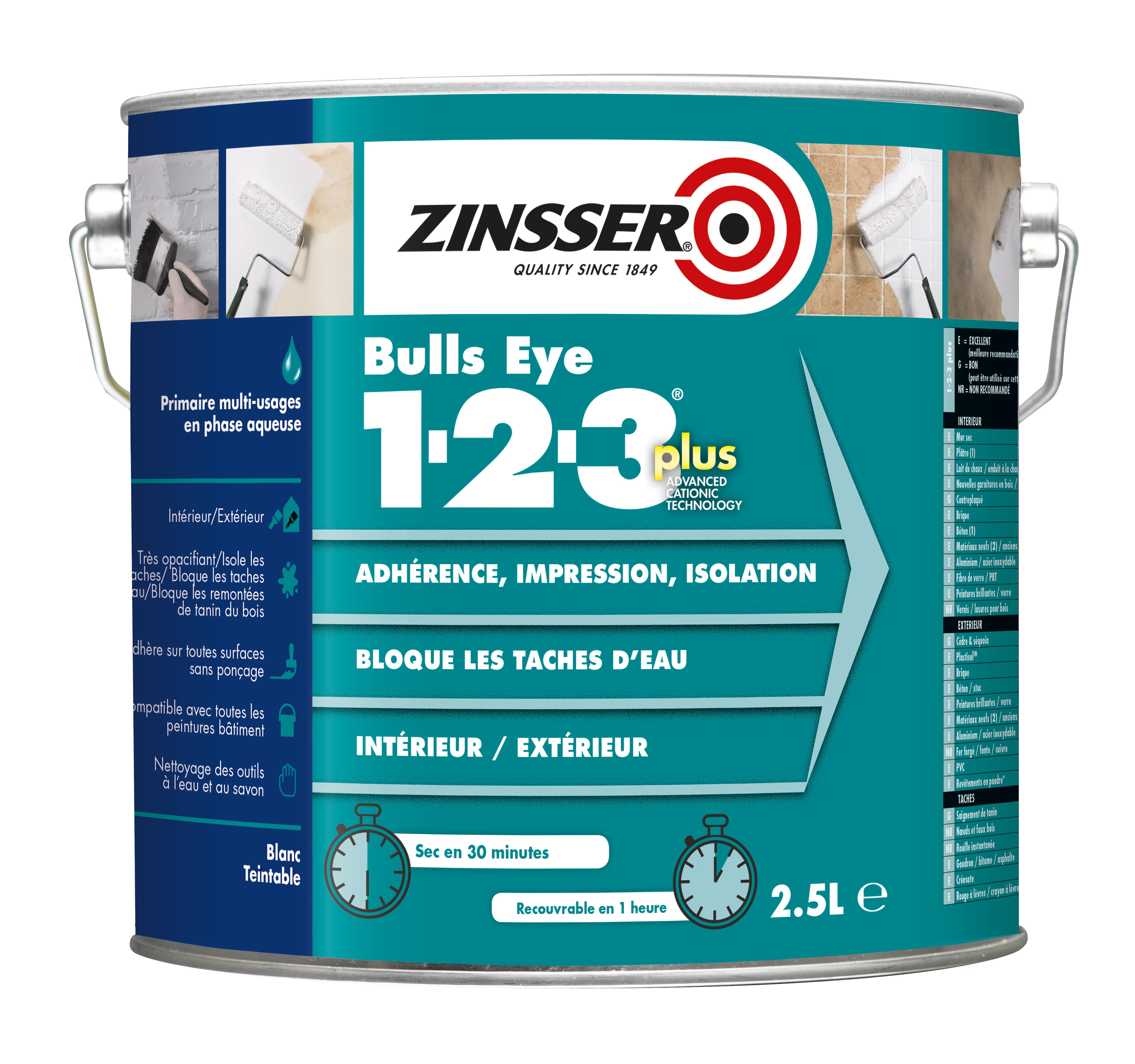 Primaire universel à base de résine ester d'époxy en phase aqueuse combinant séchage rapide et un excellent pouvoir masquant. Pour intérieur et extérieur. Bulls Eye 1-2-3 Plus isole la plupart des taches (même les taches d'eau et de suie), et adhère sur la plupart des supports sans ponçage. Mention légales : Dangereux. Respecter les précautions d’usage.