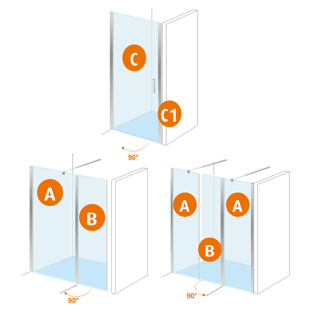 Pour les petits espaces, installer une paroi pivotante entre deux cloisons permettra la création d’un espace de douche fermé protégeant d’une part des projections d’eau et d’autre part des courants d’air. Pour cette configuration, ne pas oublier de vous équiper d’un profilé de fermeture (C1) pour veiller à une fermeture parfaite de la paroi pivotante (C) contre la cloison.