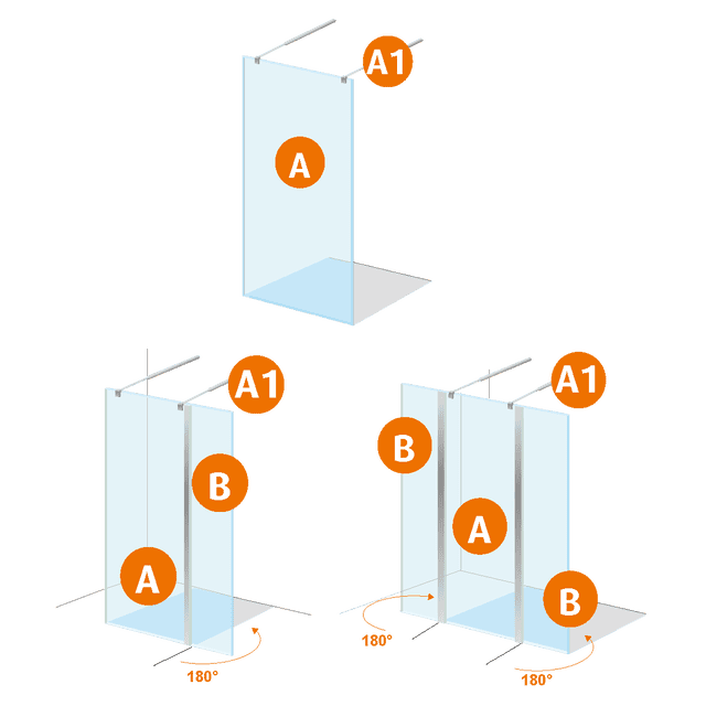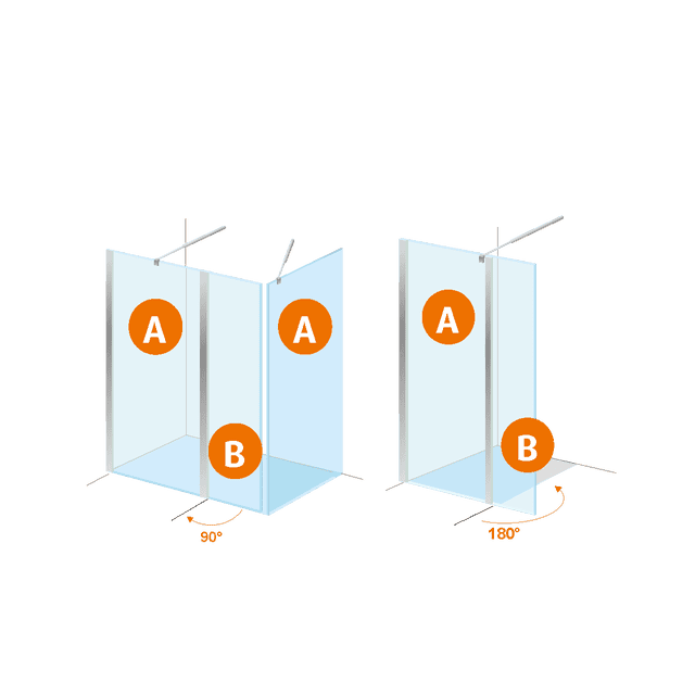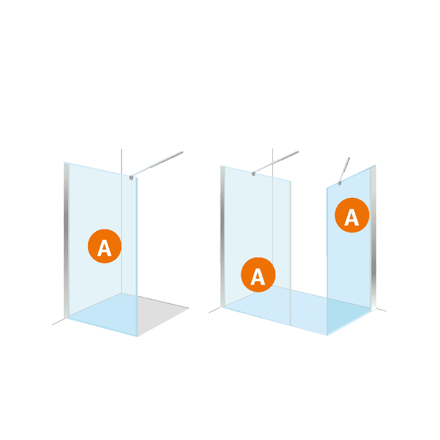 Lorsqu’il est nécessaire de protéger davantage la salle de bain des projections d’eau, la pose d’une deuxième paroi fixe (A) positionnée au bout du receveur peut être envisageable. La pose de cette dernière sera grandement facilitée du fait que le bras de fixation soit orientable. L’entrée dans la douche se fera donc entre les deux parois.