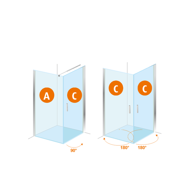 Associer une paroi de douche pivotante (C) à votre paroi de douche fixe (A) dans l’angle de votre pièce vous permet de créer un espace de douche fermé et optimisé pour une protection optimale des éclaboussures d’eau ainsi que des courants d’air.
