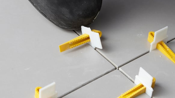 - Posez les carreaux: Commencez la pose du premier carreau àl’intersection de la ligne de référence. Utilisez des croisillonspour déterminer un espace égal pour les joints. Puis, appuyezfermement sur chaque carreau afin qu’ils puissent adhérer à lacolle.